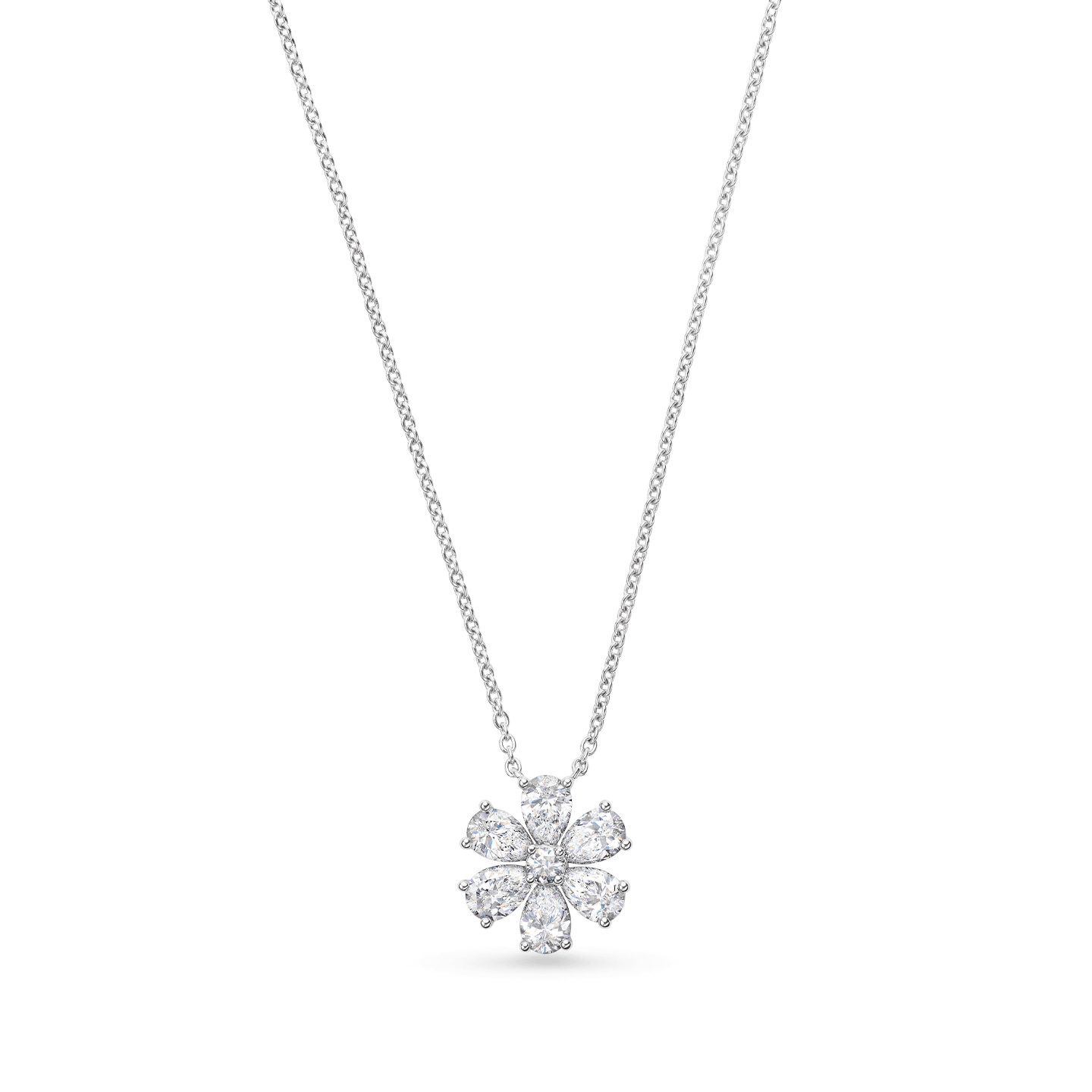 6 pear-shaped and 1 round brilliant diamond weighing a total of approximately 1.07 carats, set in platinum.