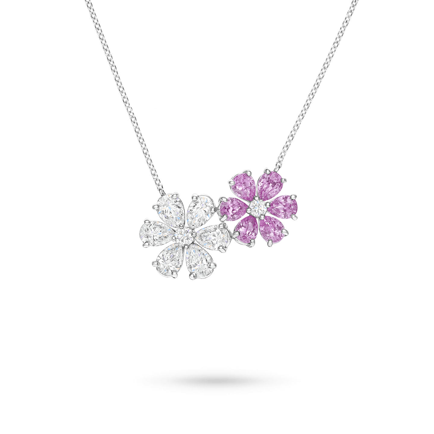 Six pear-shaped pink sapphires mingle with pear-shaped and round brilliant diamonds, their soft hues evoking the gentle grace of a wildflower. Like its namesake, this radiant pendant carries the promise of being unforgettable.