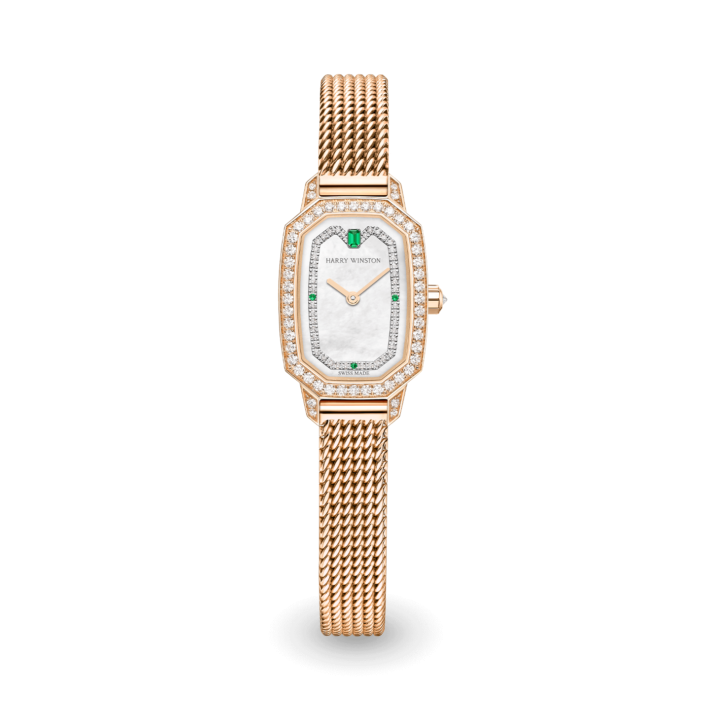 Adorned with intense green tones, diamonds and mother-of-pearl, the Harry Winston Emerald is the perfect luxury accessory for women who want both the practicality of a timepiece and the hallmark glamour of Harry Winston jewels.