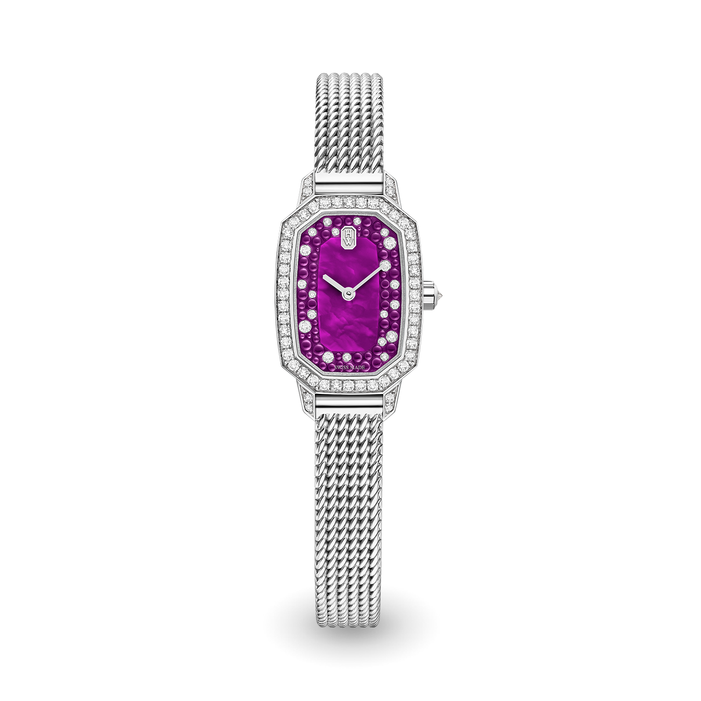 A new palette of captivating colors enriches Harry Winston’s sophisticated Emerald collection. With a winning combination of iridescent mother-of-pearl and icy diamonds, the dial of this Emerald timepiece delights with colorful cabochon adornments.