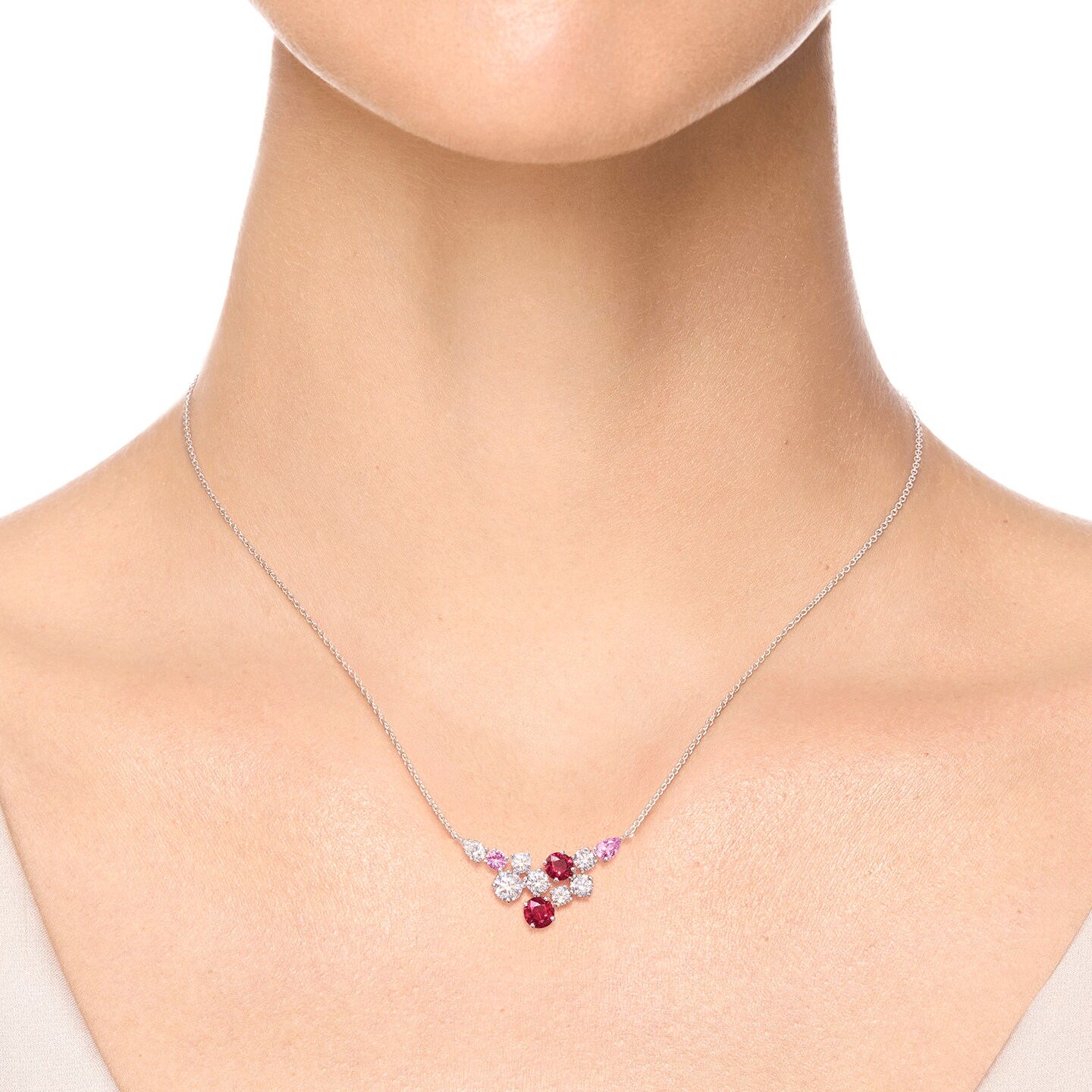 This platinum pendant sparkles with refined brilliance thanks to its arrangement of pink sapphires, rubies, and diamonds set in a delicate cluster. Its graceful design adds a touch of glamour to daily looks or serves as an elegant accent for special occasions.