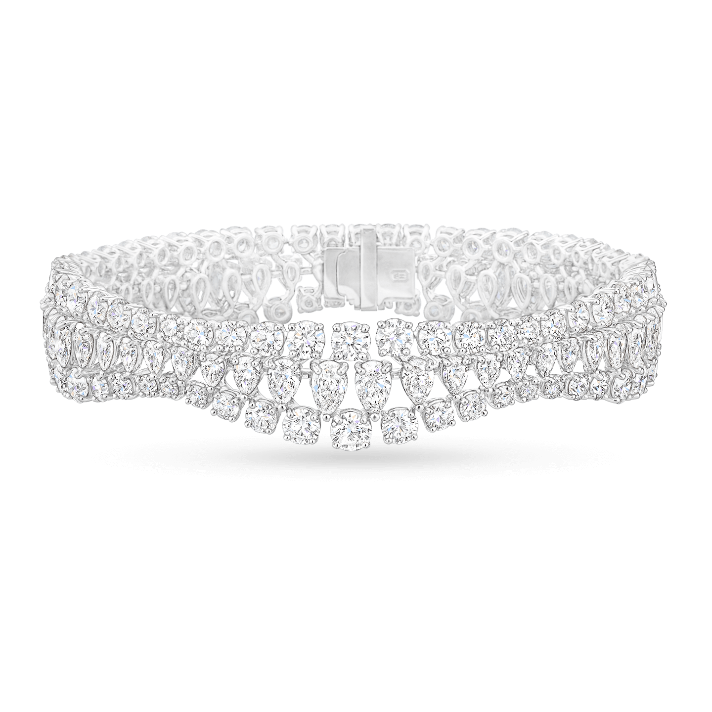 Celebrating the exceptional perfection of diamonds, this Winston Couture Diamond Bracelet features 150 round brilliant and pear-shaped diamonds set in platinum. This piece reflects the timeless spirit and grace of Harry Winston jewels, which are handcrafted to showcase the world’s most stunning gemstones. Weighing approximately 19 carats, this luxurious piece is designed to perfectly complement life’s most special occasions. The suite of jewels is comprised of a necklace, earrings, and bracelet.