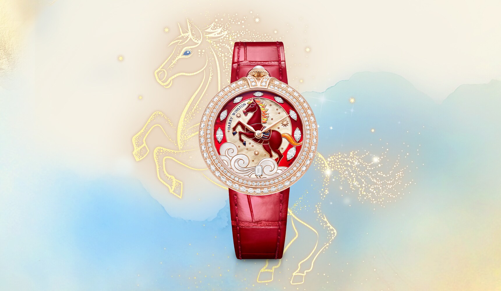 Set against a red mother-of-pearl horseshoe-shaped arch, the dazzling marquise-cut diamonds mark the hours and increase in size as they reach the iridescent white clouds below. A signature of the House, the magnificent emerald-cut diamond gracing the dial at 6 o’clock is a nod to one of Mr. Winston’s favorite gemstone cuts.