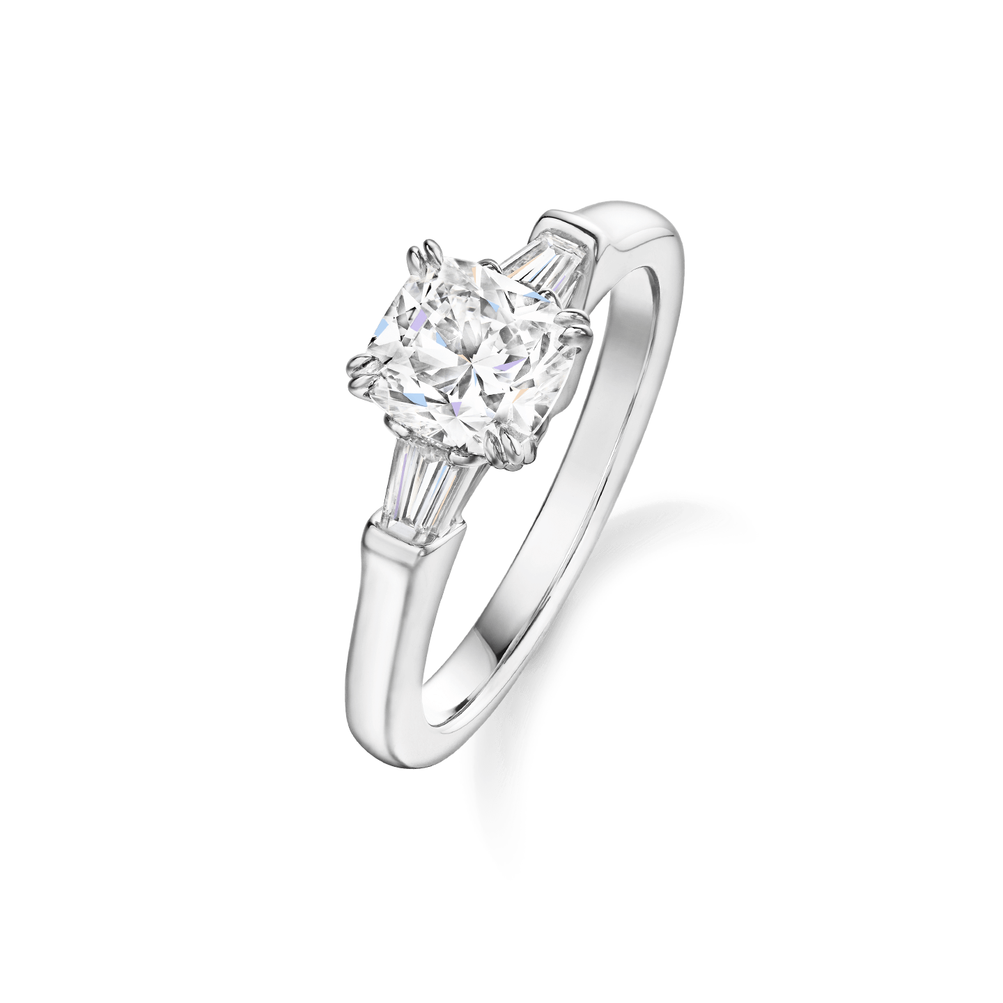 Disponible avec une pierre centrale à partir de 1.00 carat, cette bague de fiançailles est sertie d’un diamant taille coussin et de pierres latérales taille baguette, l’ensemble monté sur platine. Un poids de pierre plus élevé est disponible sur demande.