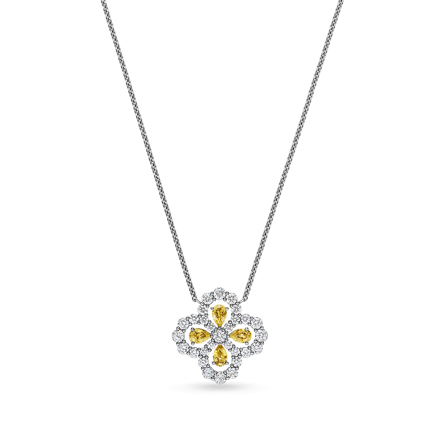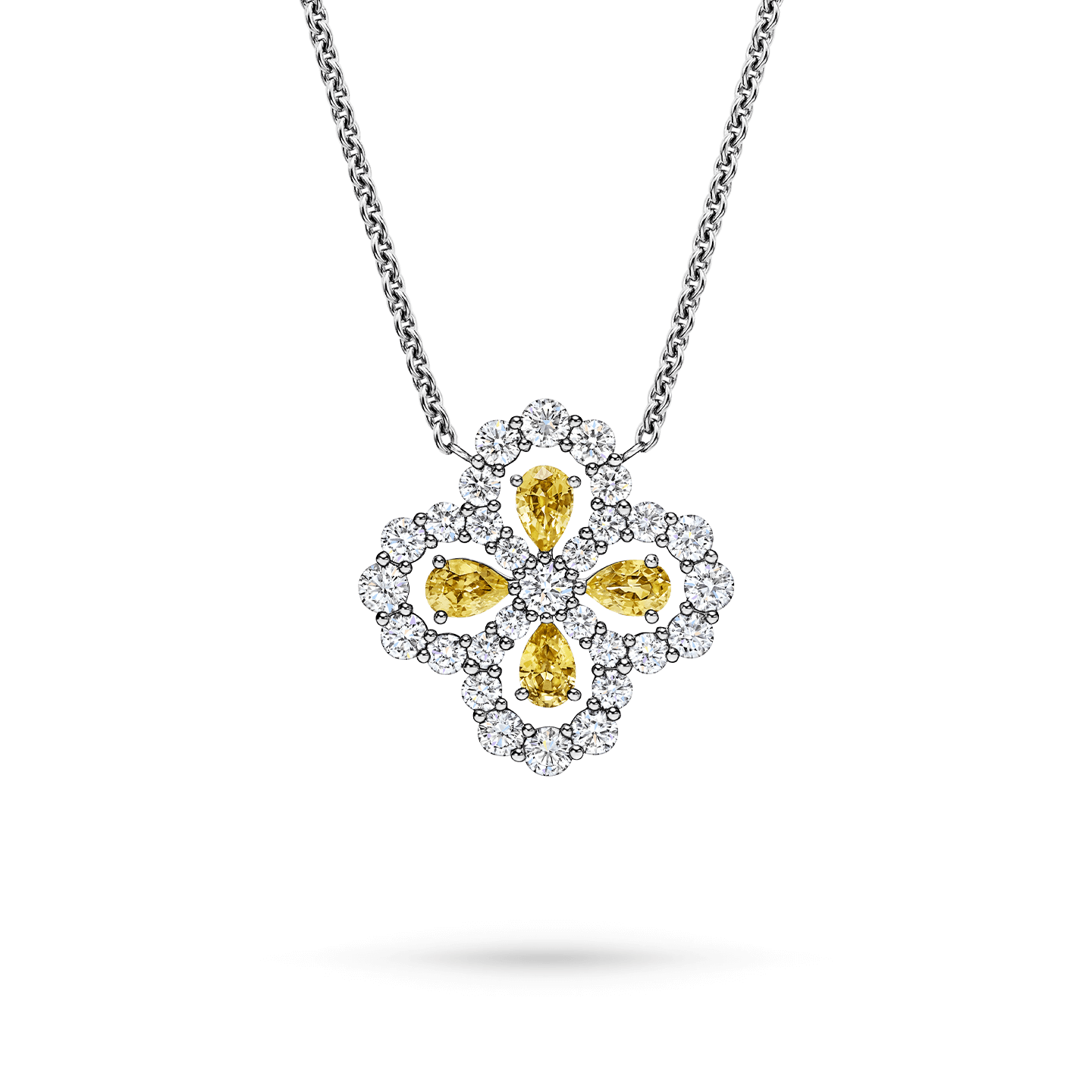 4 saphirs jaunes taille poire d’un poids total d’environ 0.85 carat et 29 diamants taille brillant d’un poids total d’environ 1.33 carats, monture en platine.