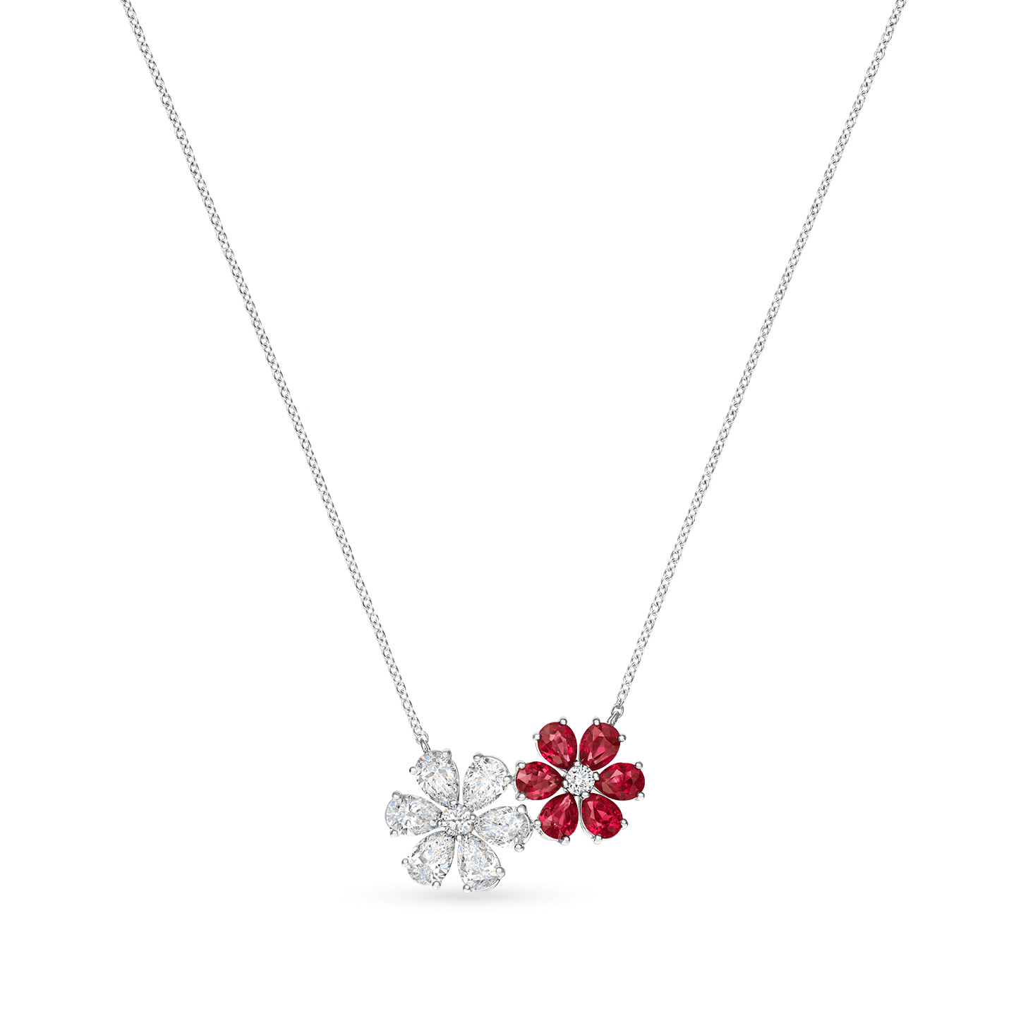 Six rubis en forme de poire et huit diamants taille poire et brillant s’unissent dans ce saisissant pendentif Twin Forget-Me-Not. À la fois gracieux et lumineux, ce bijou apporte une touche de couleur intense et un éclat romantique au décolleté.