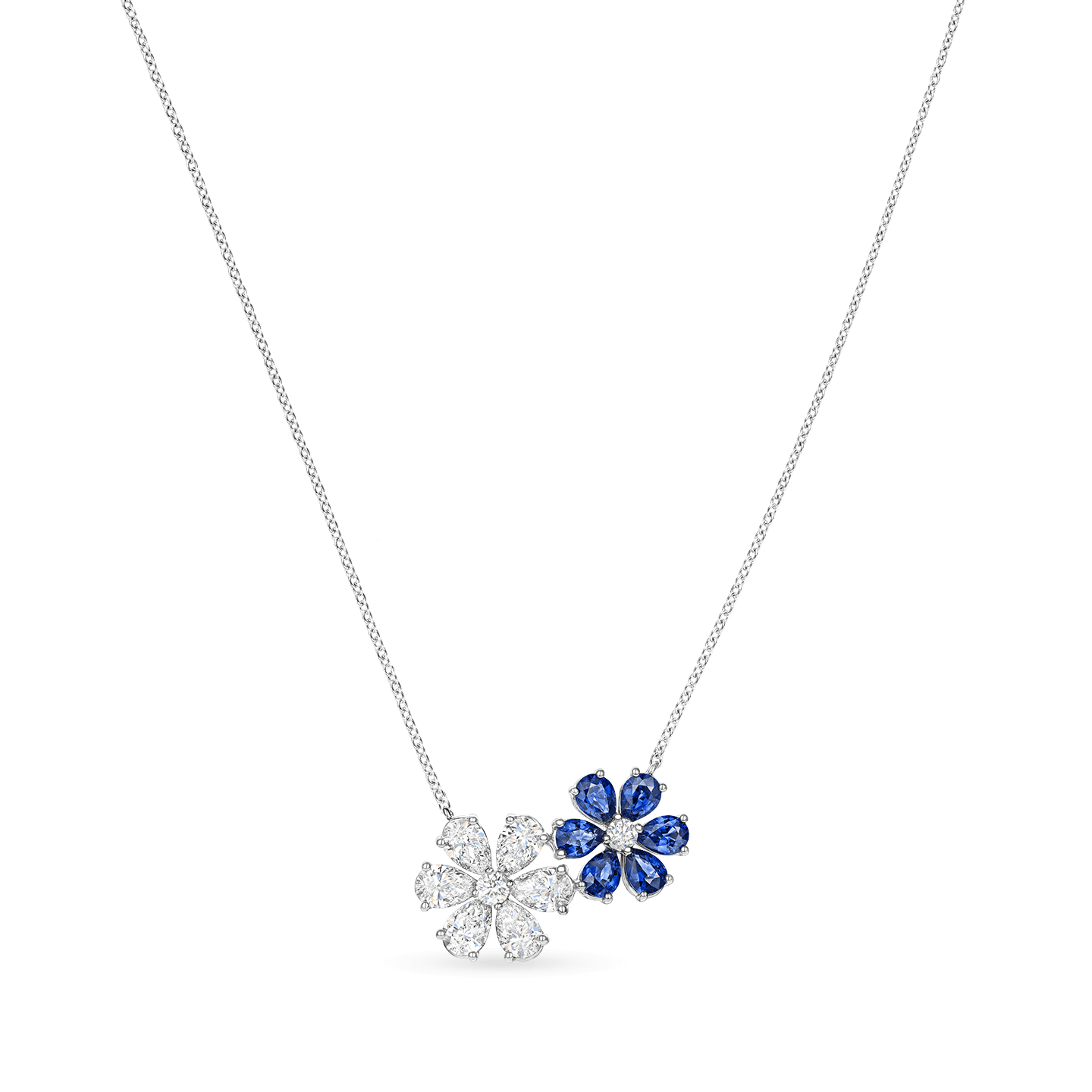 Ce gracieux pendentif Forget-Me-Not scintille de 6 saphirs taille poire, associés à des diamants taille poire et brillant. Inspiré par la beauté d’une fleur sauvage en pleine floraison, ce bijou apporte une touche lumineuse de bleu au décolleté.
