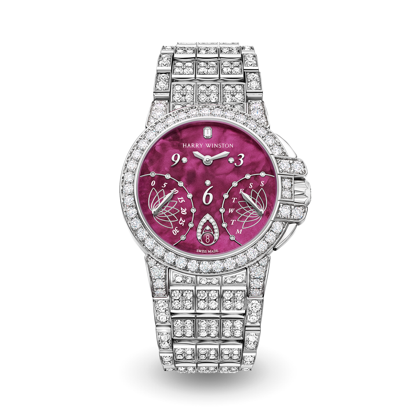 La Maison Harry Winston a célébré le 20e anniversaire de la collection Ocean avec ce garde-temps Ocean Biretrograde. Les complications traditionnelles de la famille Ocean, comme les compteurs rétrogrades et les heures et minutes excentrées, dominent ce nouveau modèle aux couleurs éclatantes, orné de nacre et de diamants étincelants.