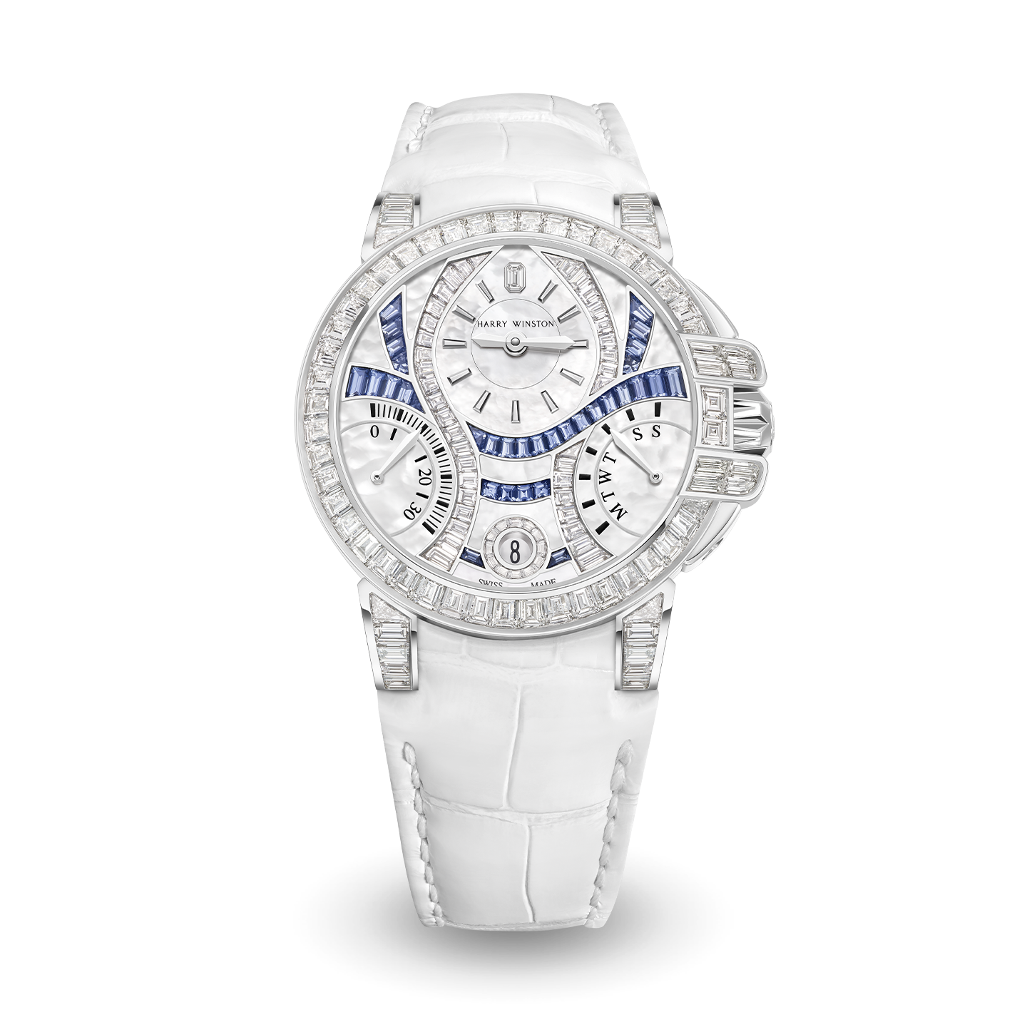 La Maison Harry Winston dévoile une montre Ocean en or blanc capturant l’esprit aquatique et sport-chic de la collection. Son cadran scintillant recouvert de nacre naturelle et serti de saphirs bleus et de diamants blancs retrace le mouvement des vagues tout en faisant référence à l’histoire d’amour liant Harry Winston aux pierres précieuses et à leurs sertis exceptionnels et dynamiques.