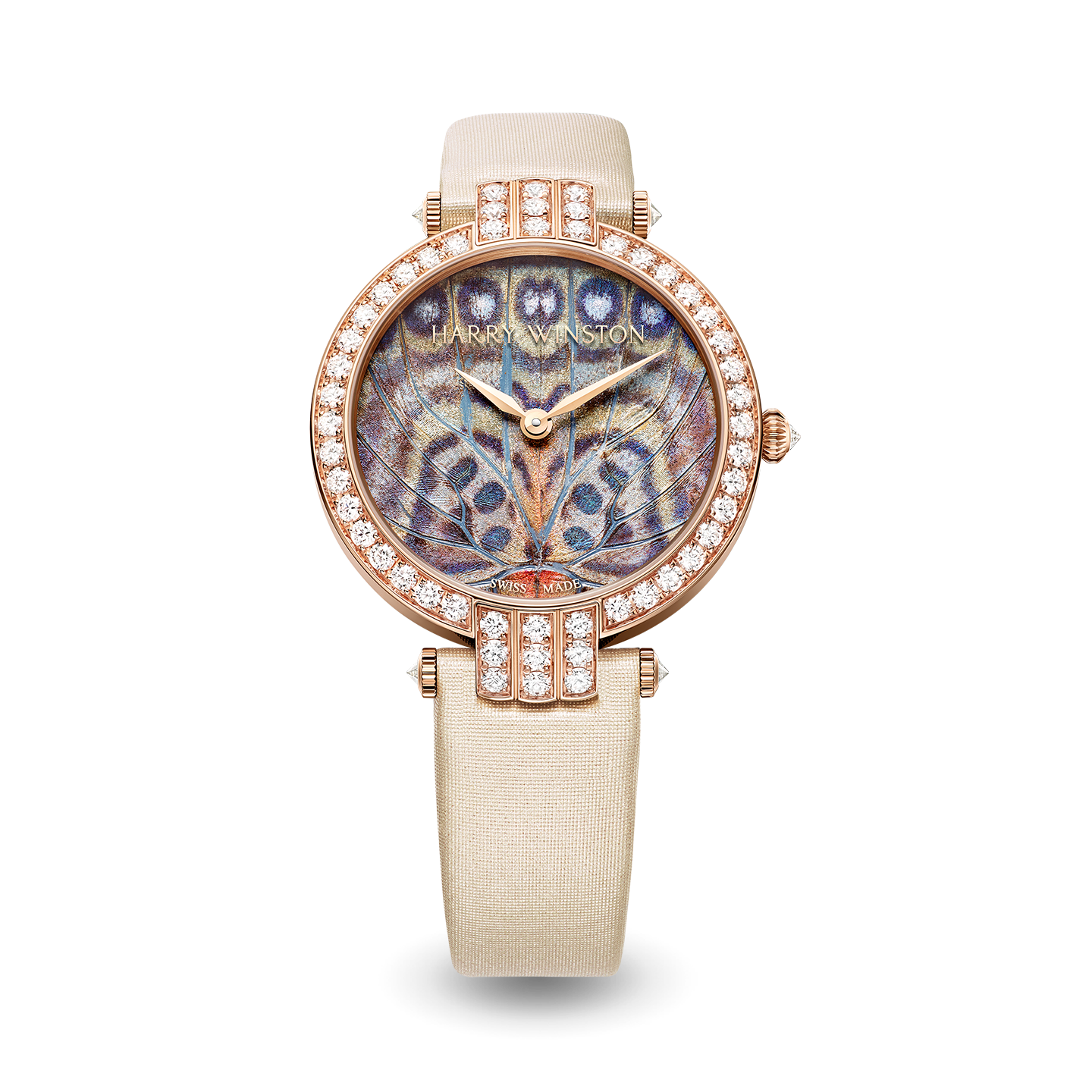 La Maison Harry Winston poursuit son exploration d’alliances inattendues et de techniques inédites. L’élément choisi pour cette création est empli d’émotion et de symbolisme. Les vibrantes couleurs ornant le garde-temps Premier Precious Butterfly proviennent de la poudre se trouvant sur les ailes des papillons. Cette poudre, qui est une matière fragile, possède une iridescence extraordinaire.