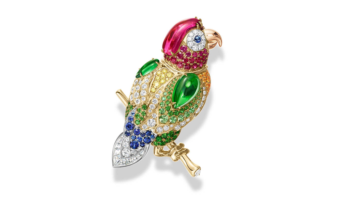 La broche Hummingbird évoque la beauté éphémère de son homonyme en plein vol. Sertie de saphirs, tsavorites, aigues-marines et diamants, le bijou irradie de nuances de vert et de bleu, rappelant l'iridescence naturelle de l'oiseau. Une perle en forme de poire des mers du Sud, délicatement suspendue à son bec, évoque l’image de l’oiseau en train de savourer le nectar, insufflant mouvement et vie à ce design exquis.