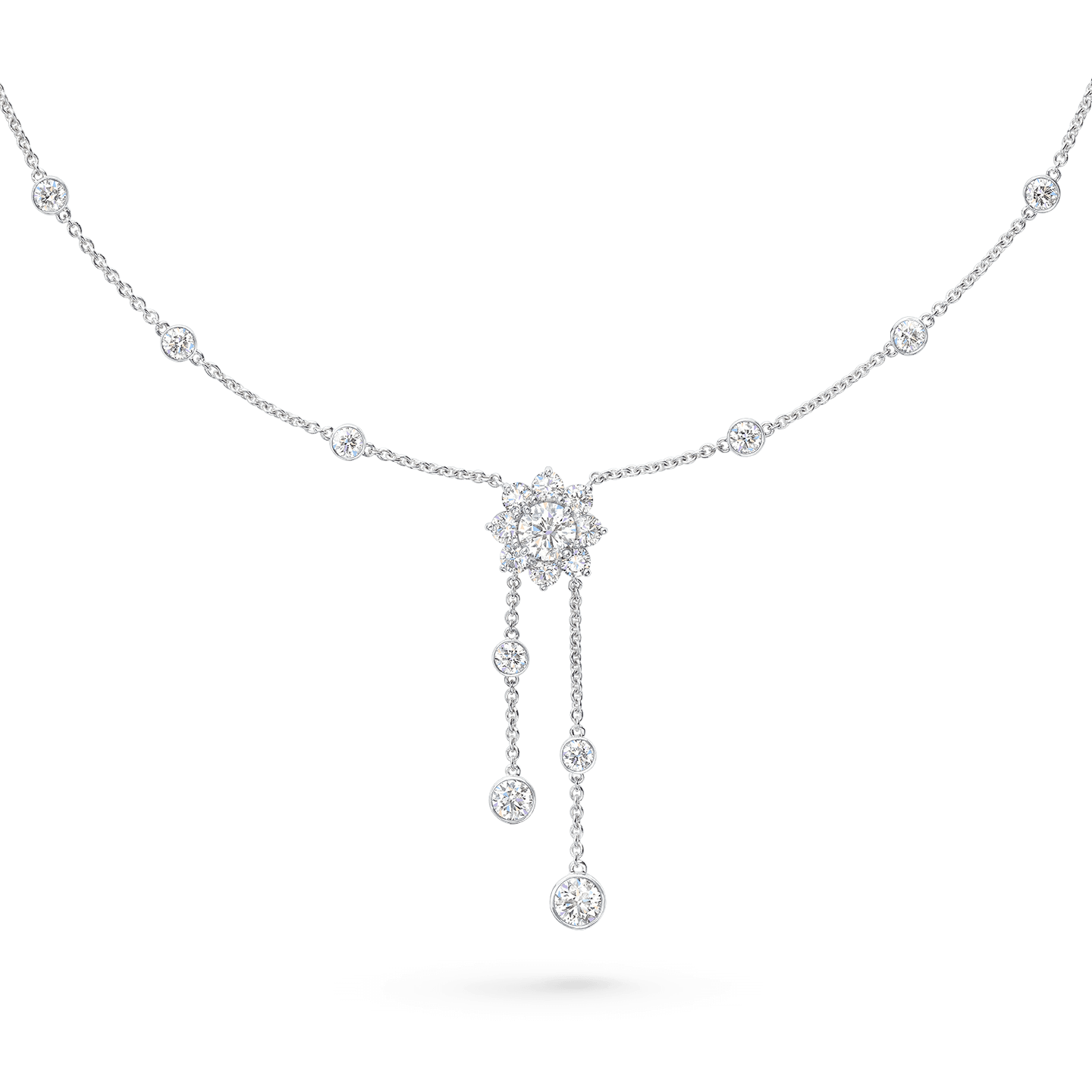 Dans un jardin luxuriant, une femme parée de scintillantes créations en diamant de la collection Sunflower s’avance à travers une allée fleurie. La caméra zoome d’abord sur la bague Sunflower Toi et Moi en diamant et la bague Sunflower en diamant qui brillent sous le soleil. Elle découvre ensuite les boucles d’oreilles Sunflower en diamant, qui créent un jeu de lumière à chaque mouvement, avant de révéler le collier lariat Sunflower en diamant qui illumine le décolleté de la femme.