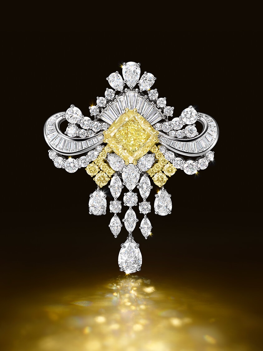 La broche en diamant jaune illustre le goût de Harry Winston pour le spectaculaire, centrée sur un diamant jaune fancy intense de 9,81 carats. Des rangs de diamants en cascade ajoutent drame et mouvement, faisant de cette pièce une véritable célébration de gemmes extraordinaires.