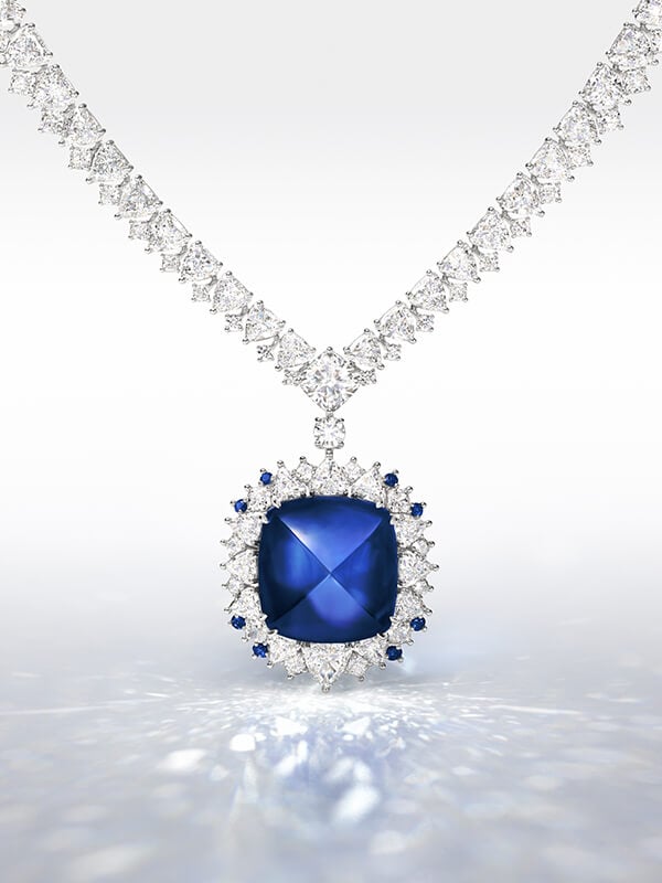 Le collier met en valeur un magnifique saphir cabochon pain de sucre de 65,61 carats. Incarnant l’héritage de M. Winston en tant que « Rare Jeweler of the World », la pierre centrale trône au cœur d’un collier de diamants composé de diamants taillés sur mesure en forme de pyramide.