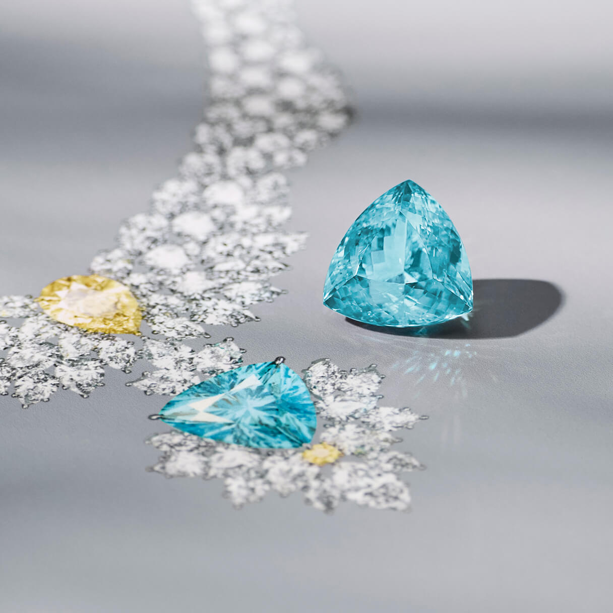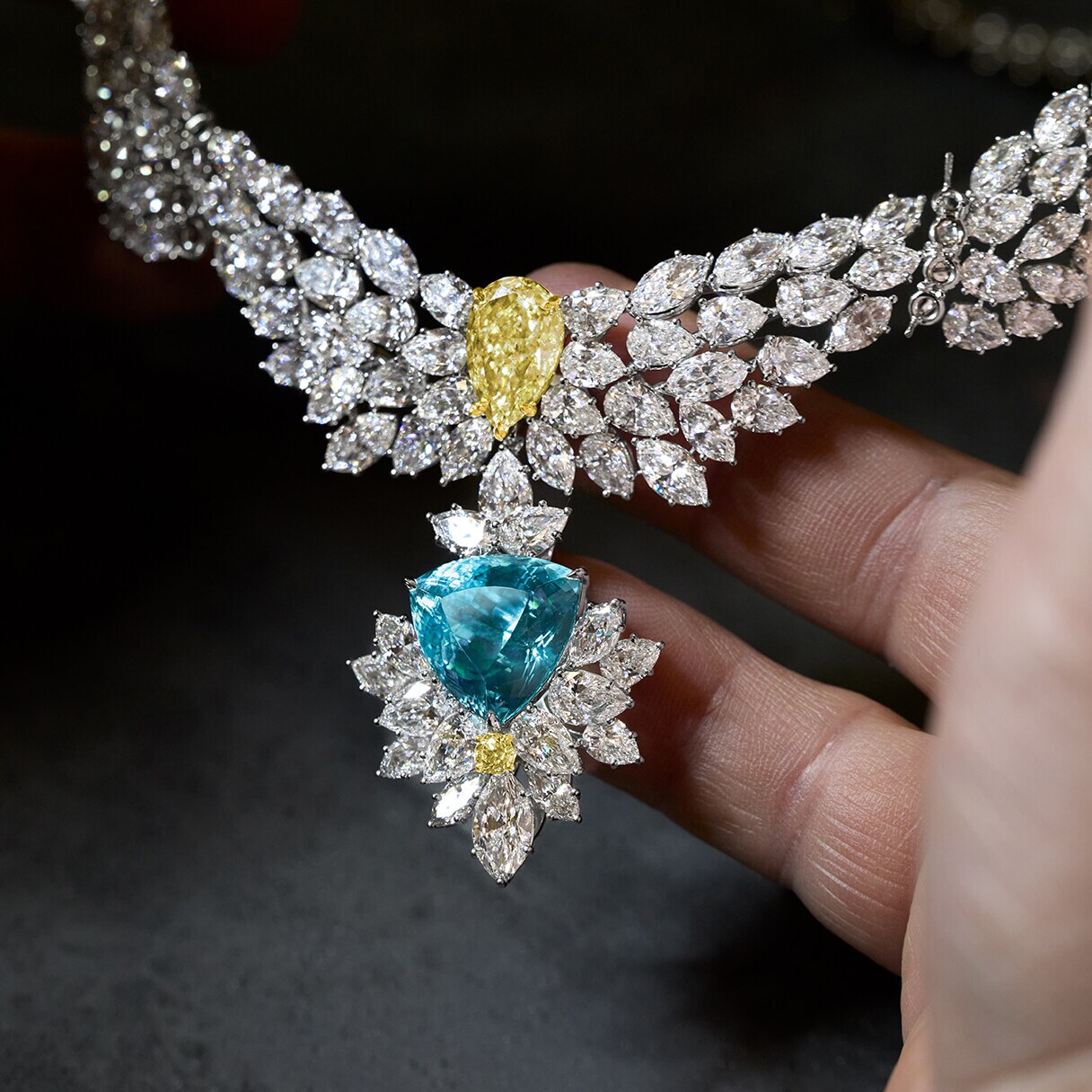 Au centre de cette création exceptionnelle, une tourmaline Paraíba triangulaire de 16,10 carats, d’une intensité captivante, est sublimée par un diamant jaune lumineux taille poire de 5,01 carats et plus de 65 carats de diamants blancs scintillants. Cette composition remarquable reflète la philosophie de M. Winston, centrée autour du diamant.