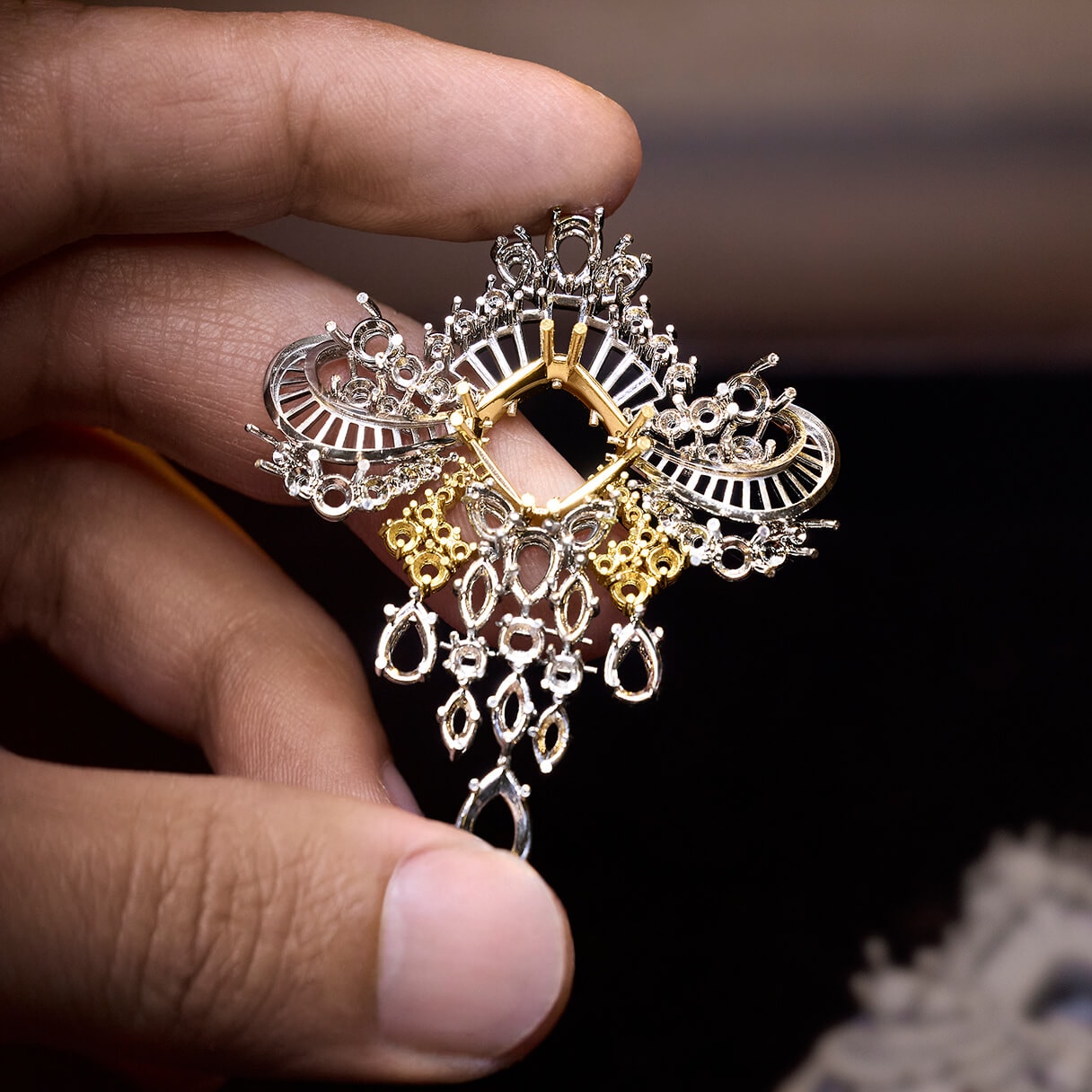 Au cœur de cette composition envoûtante se déploie un diamant jaune taille coussin de 9,81 carats, choisi pour l’intensité exceptionnelle de sa couleur et l’éclat de sa lumière. La pierre centrale est entourée d’un délicat assemblage de diamants jaunes et blancs, dans une célébration harmonieuse de la radiance.