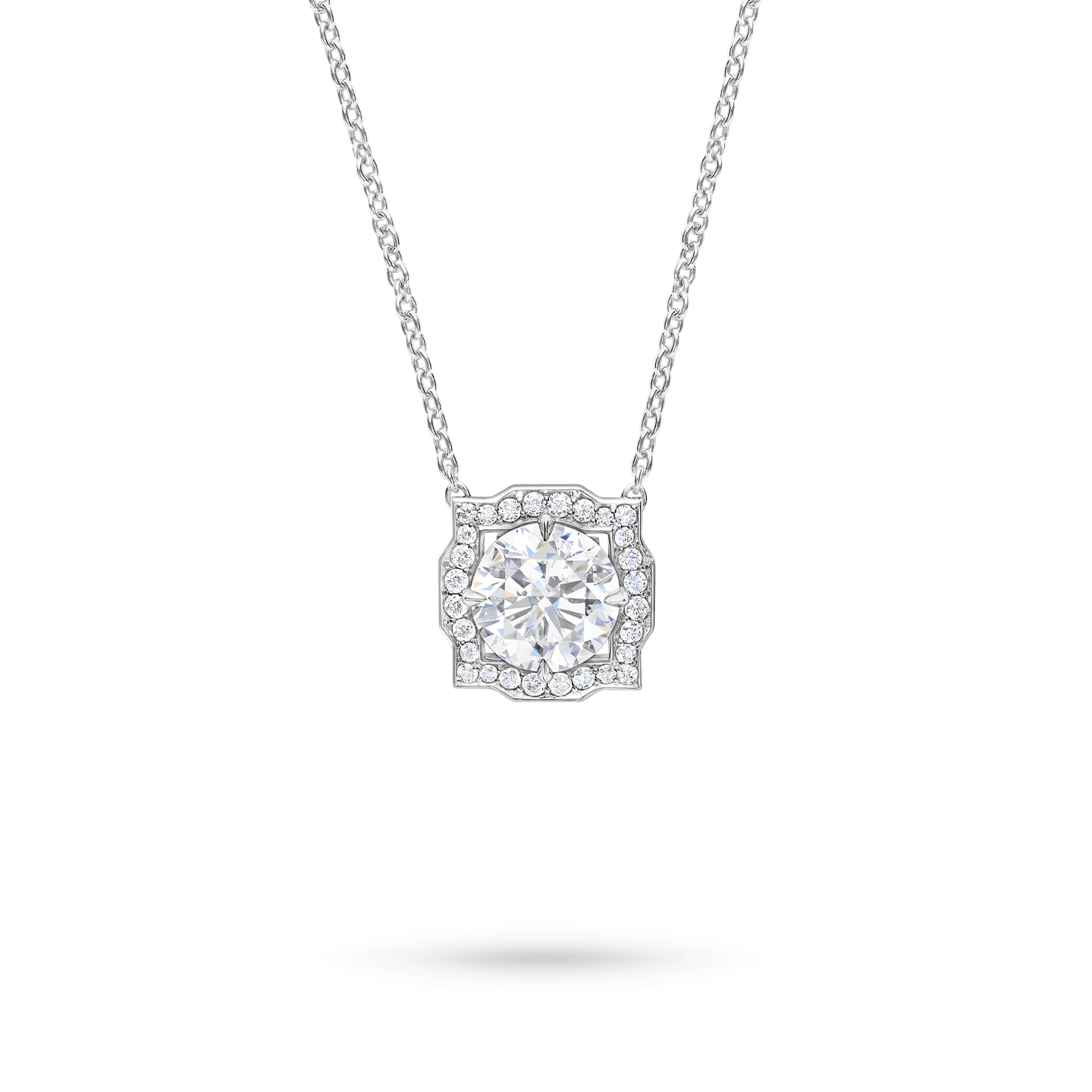 ラウンド・ブリリアントカット・ダイヤモンドのセンターストーンを、幾何学的なベゼルフレームが引き立てて。