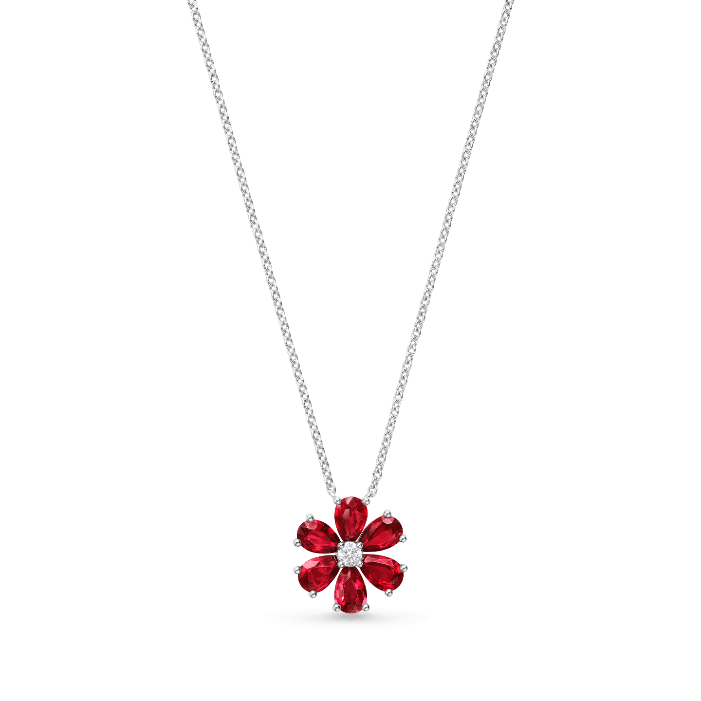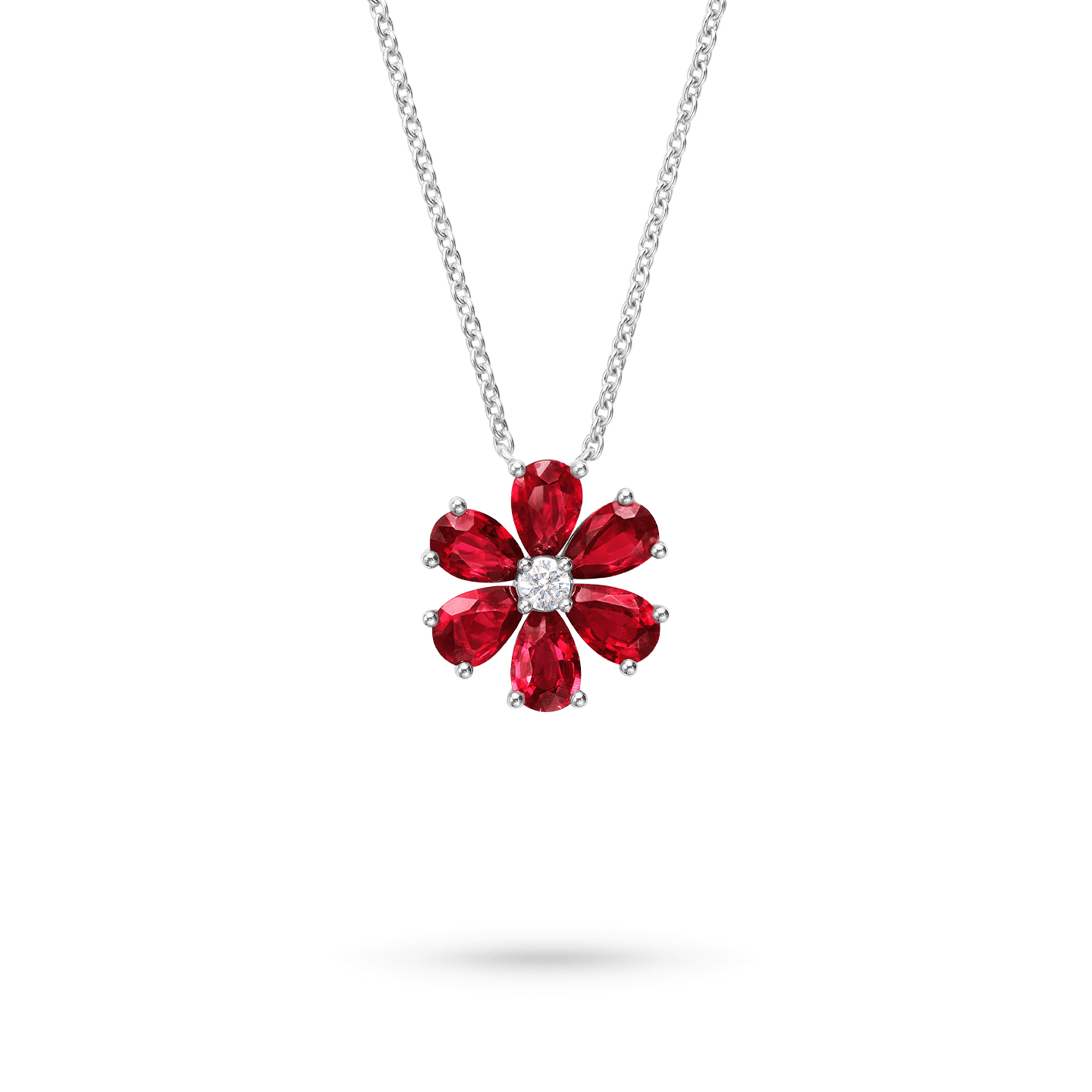 ルビーとダイヤモンドで忘れな草の繊細な美しさを表現した優美なペンダント。6個のペアシェイプ・ルビー(計約1.68カラット)と1個のラウンド・ブリリアントカット・ダイヤモンド(計約0.04カラット)がプラチナにセットされています。創業以来、ハリー・ウィンストンのジュエリーデザインは自然が生み出す美しさからインスピレーションを得てきました。シンメトリーに配置されたジェムストーンが優美なエレガンスを醸すこのジュエリーは、自然からの最高の贈り物である咲き誇る花の美しさを想起させます。
