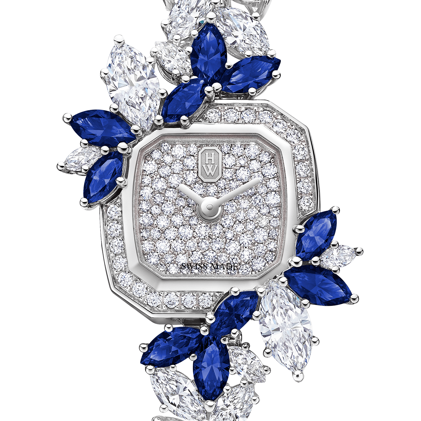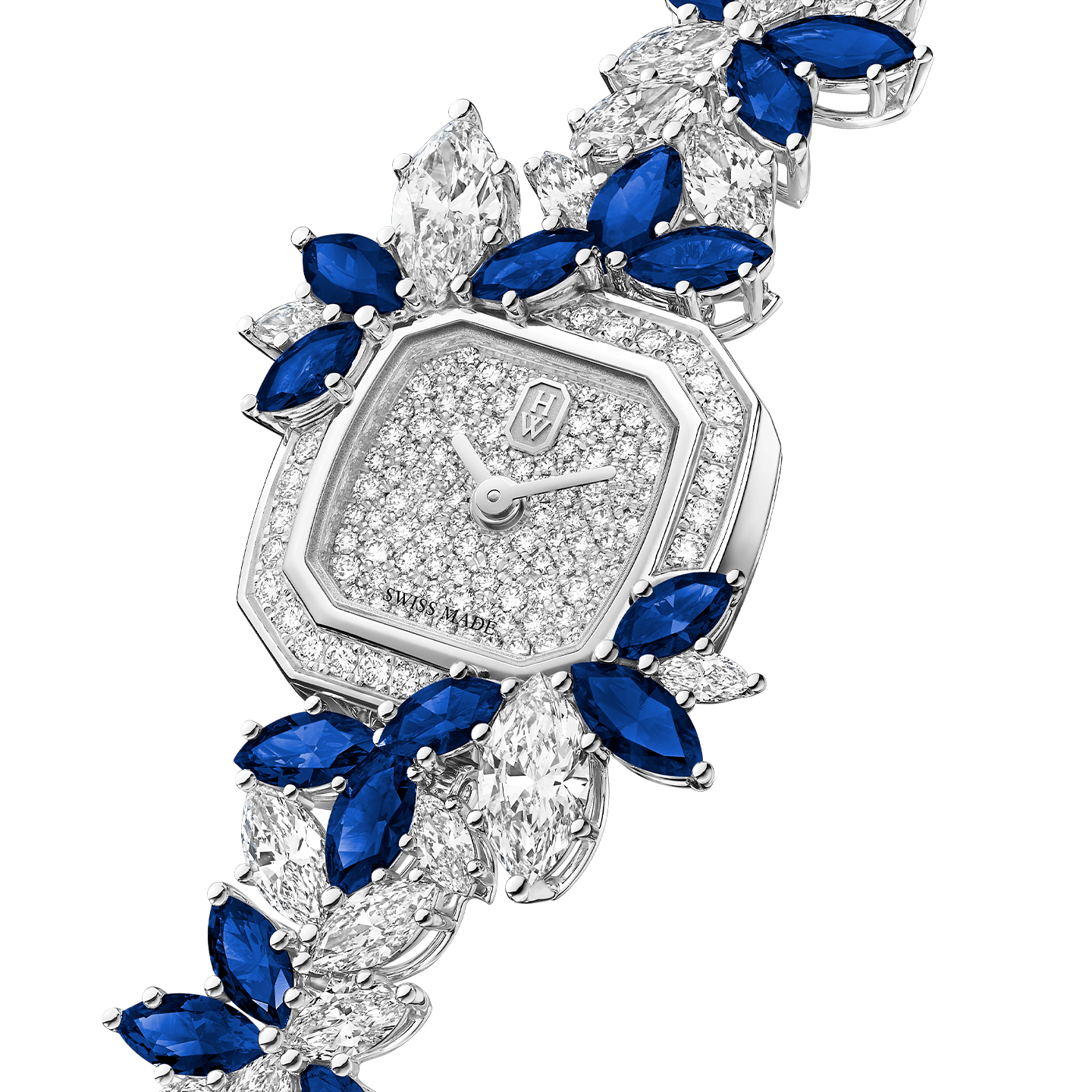 ブランドを代表するモチーフで自然の美しさを表現した「プレシャスエメラルド・バイ・ハリー・ウィンストン」。ダイヤモンドとブルーサファイアを贅沢に配したプラチナ製ブレスレットが気品に満ちた輝きを放ち、至高のエレガンスを演出します。