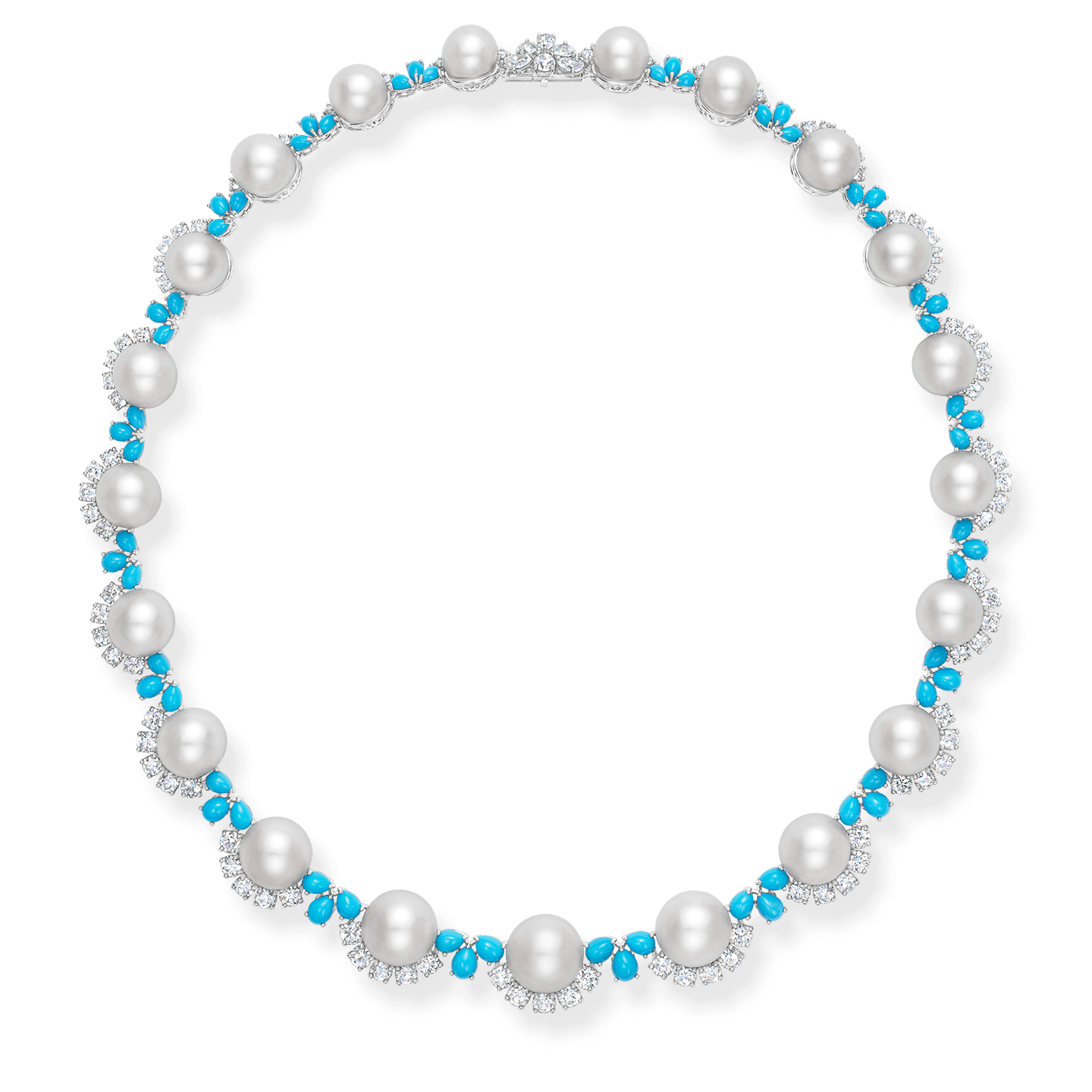 ダイヤモンドとペアシェイプ・ターコイズカボションの鮮やかな色彩に引き立てられた各7.41カラットのホワイト南洋パールが、豊かな表情を湛えます。
