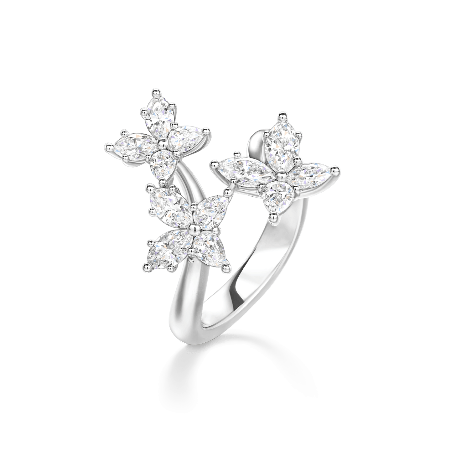 12個のマーキースカットとペアシェイプのダイヤモンドをあしらった、大胆かつモダンなデザインのトリプルモチーフ・リング。タイムレスなダイヤモンドカットと現代的な美意識が融合したこの唯一無二のジュエリーは、視線を集める魅惑的なシルエットを描きだします。