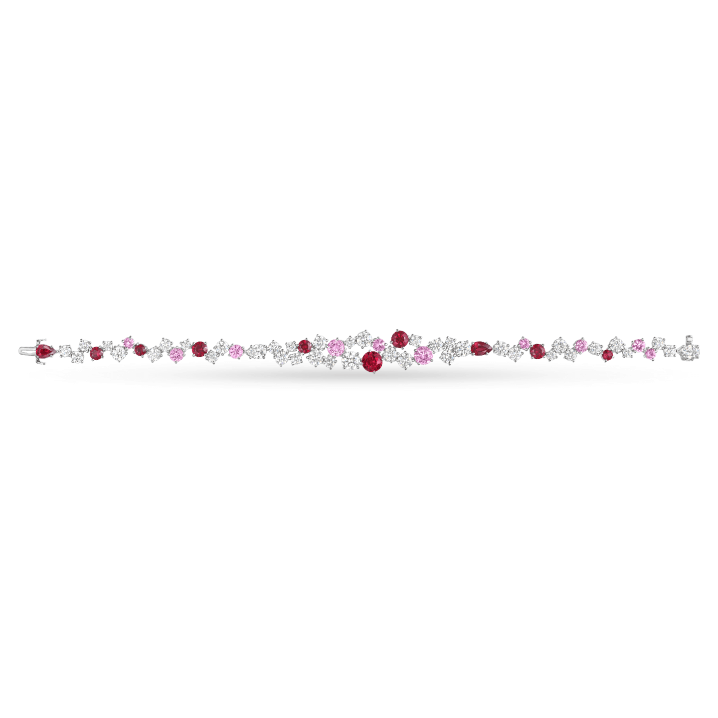 ラウンドカット・ピンクサファイア、ラウンドカット&ペアシェイプ・ルビー、ダイヤモンドがプラチナにセットされたこのブレスレットは、豊かな色彩と輝きを放ちます。芸術的なクラスターデザインが一つひとつの宝石の自然な輝きを引き立て、手首に華やかな表情と煌めきをもたらします。