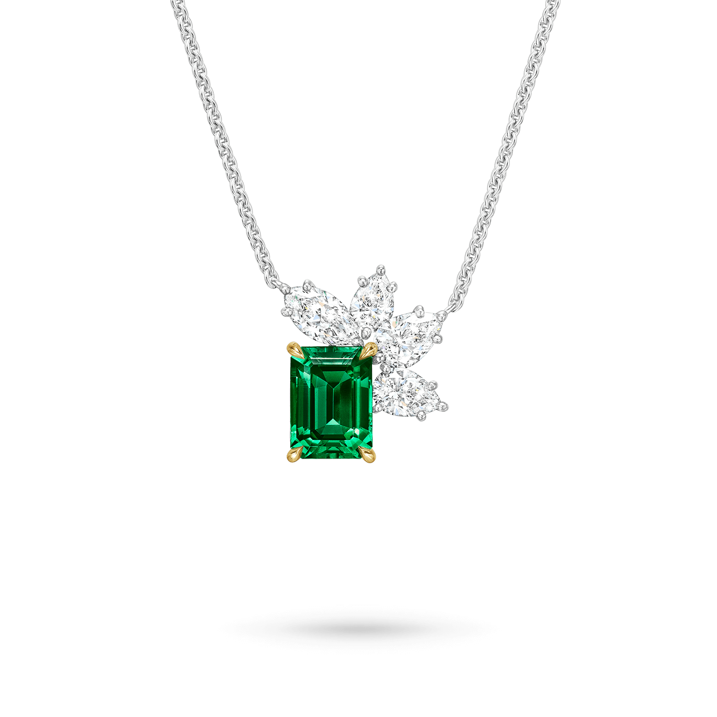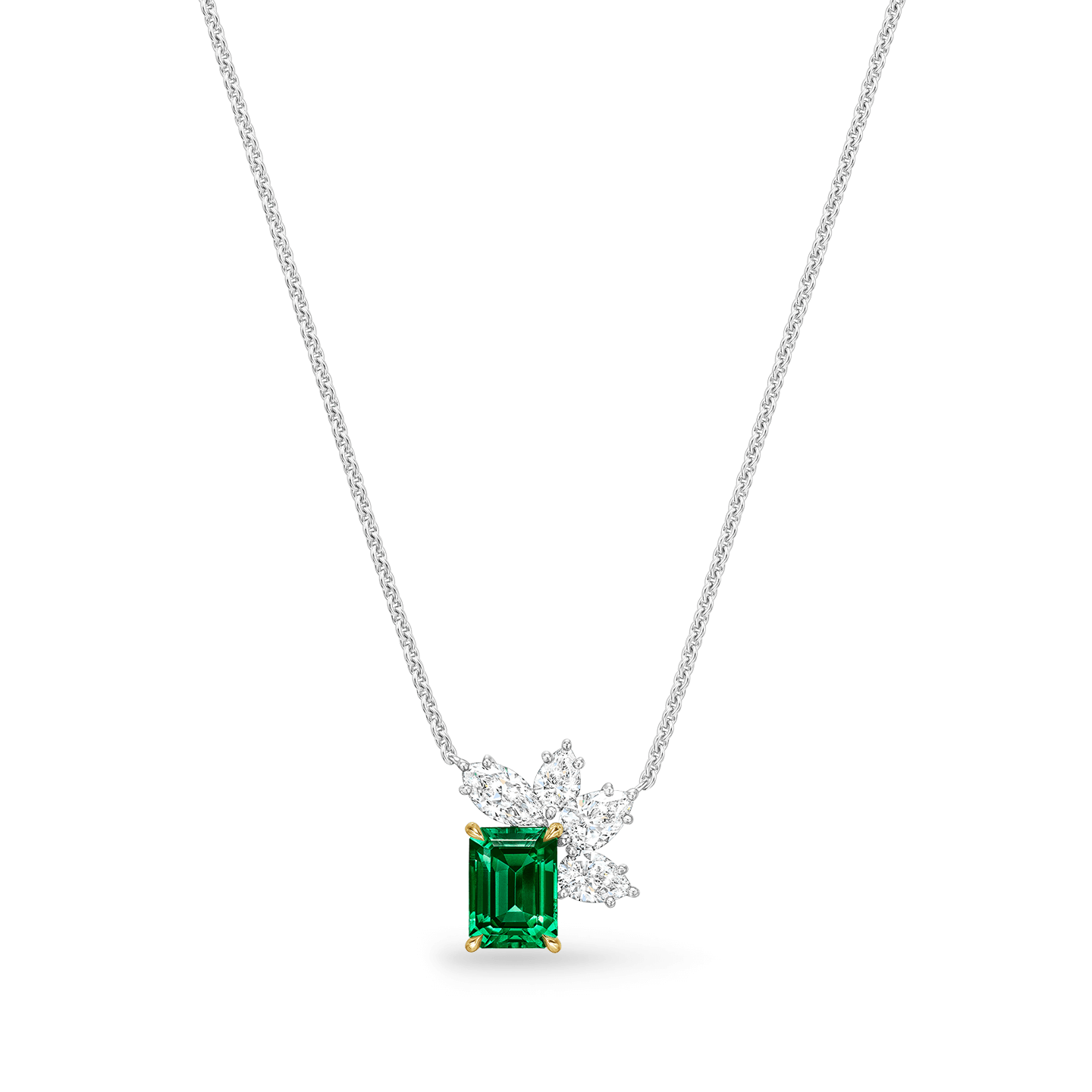 センターで輝くエメラルドカット・エメラルドを囲むマーキースカットとペアシェイプのダイヤモンドが、その鮮やかな色合いを引き立てて。18Kイエローゴールド×プラチナ製のこのペンダントは、あらゆるオケージョンで時代を超えたエレガンスを湛えます。