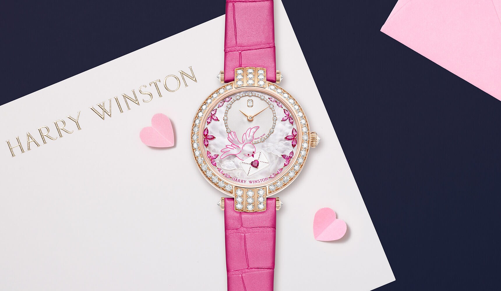 深紅のルビーと華やかなピンクサファイアが、清らかな情景にロマンティックな彩りを添えます。ダイヤルの外周に沿って配置されたマーキースカットのジュエルは、ハリー・ウィンストンを象徴するアイコニックなセッティングにオマージュを捧げています。1940年代に生み出されたこの技法は、創始者ハリー・ウィンストンとデザイナーたちが個々の宝石の美しさを際立たせるために生み出したもので「クラスター・セッティング」として知られています。ほとんど地金が見えないほどの繊細なセッティングにより、宝石のファセットが光と交わり、その輝きが最大限に引き出されます。文字盤の3時と9時の位置に配された6個のマーキースカット・ルビーは、花びらのように配置され、あらゆる方向から光を受け止めています。ルビーの両脇には淡い色合いのマーキースカット・ピンクサファイアが添えられ、さらに淡く色づくピンクサファイアへと移ろう、グラデーションセッティングが採用されています。