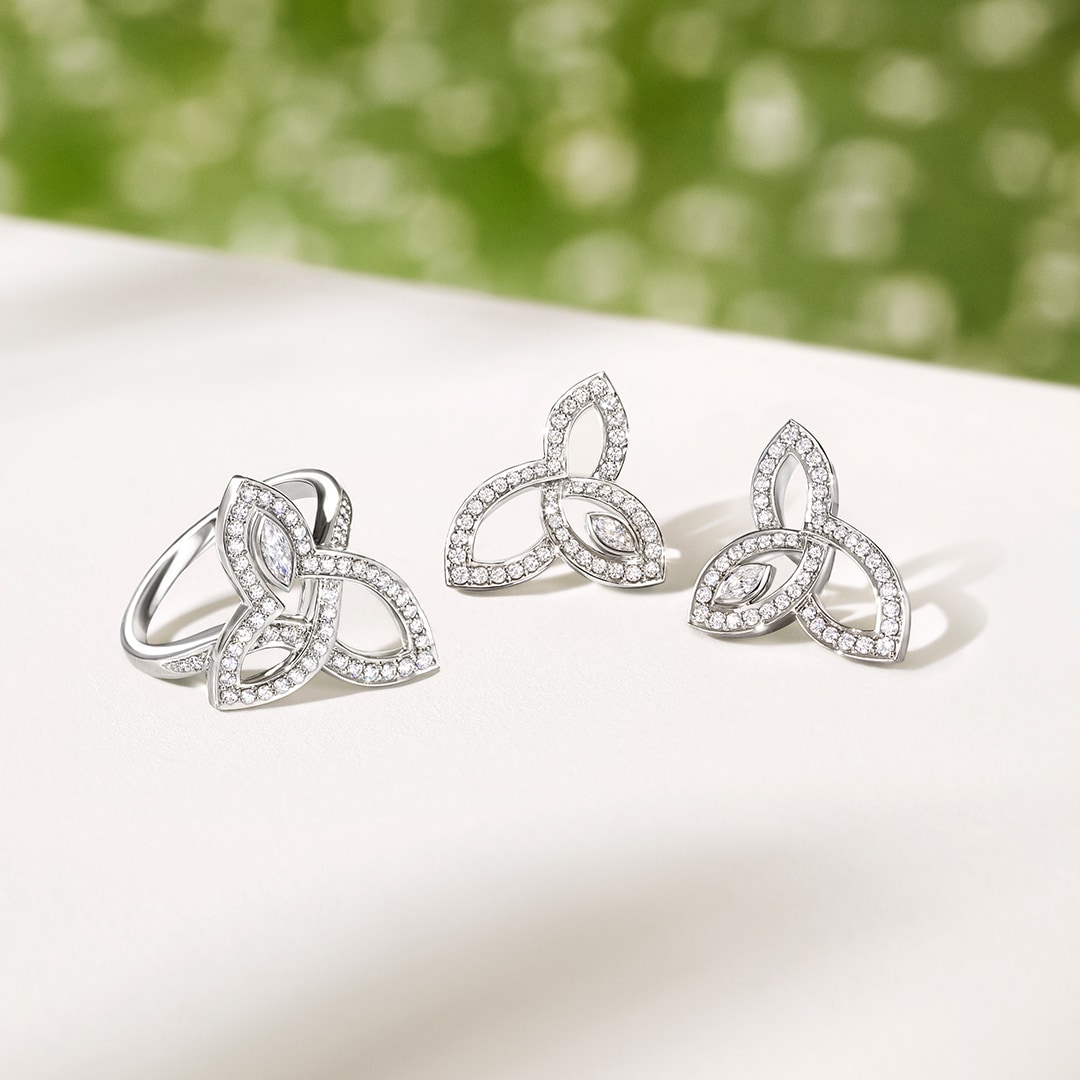 1940年代初頭のスケッチをインスピレーション源として誕生した、リリークラスター・コレクション。プラチナ、イエローゴールド、ローズゴールドにセッティングされたダイヤモンドが繊細に交わり、咲き誇るユリの優美なフォルムを描き出します。また、新たなバリエーションであるインフィニット・リリークラスターは、まるでガーデンで羽ばたく蝶のように軽やかに舞い、エレガンス、躍動感、そして新たな始まりを表現しています。