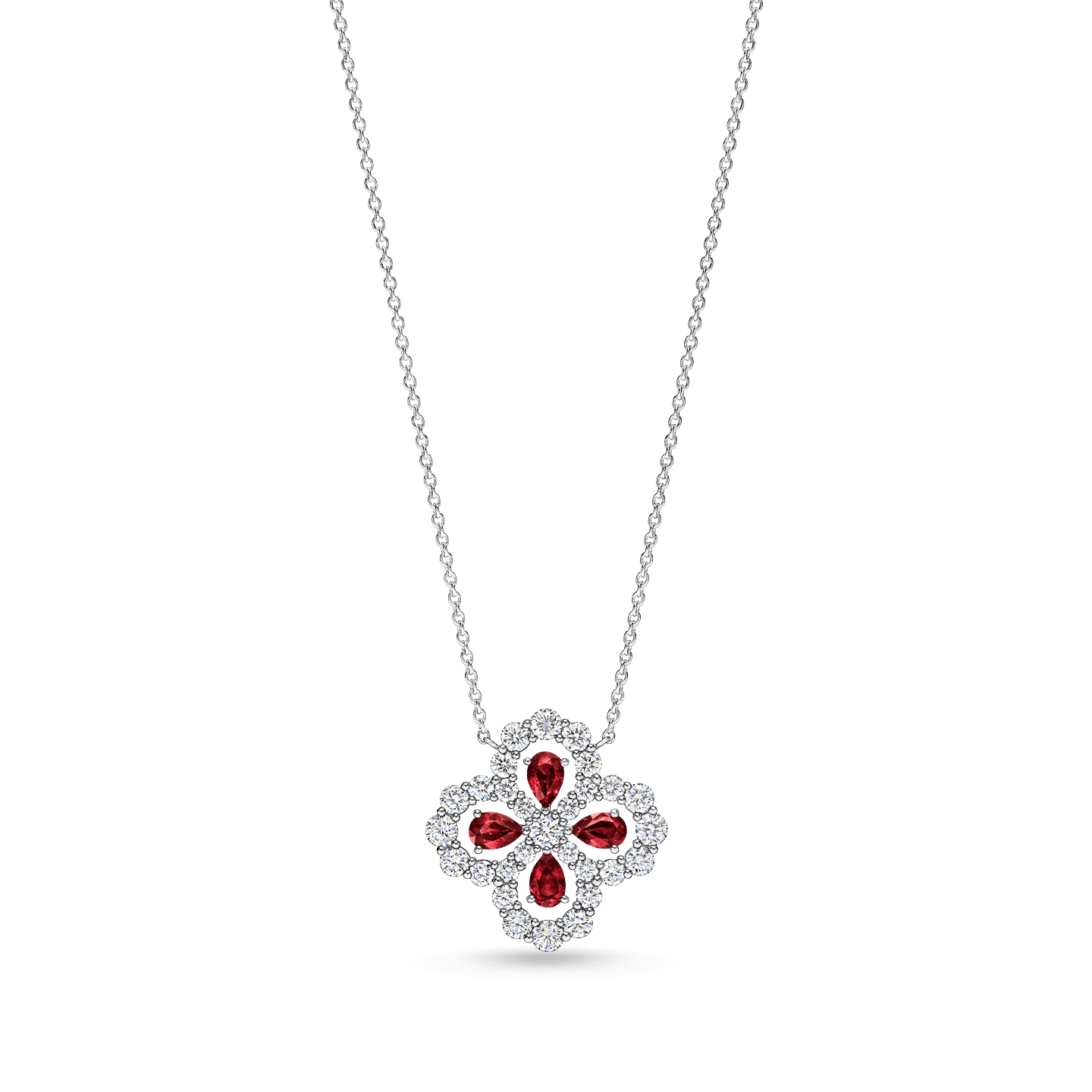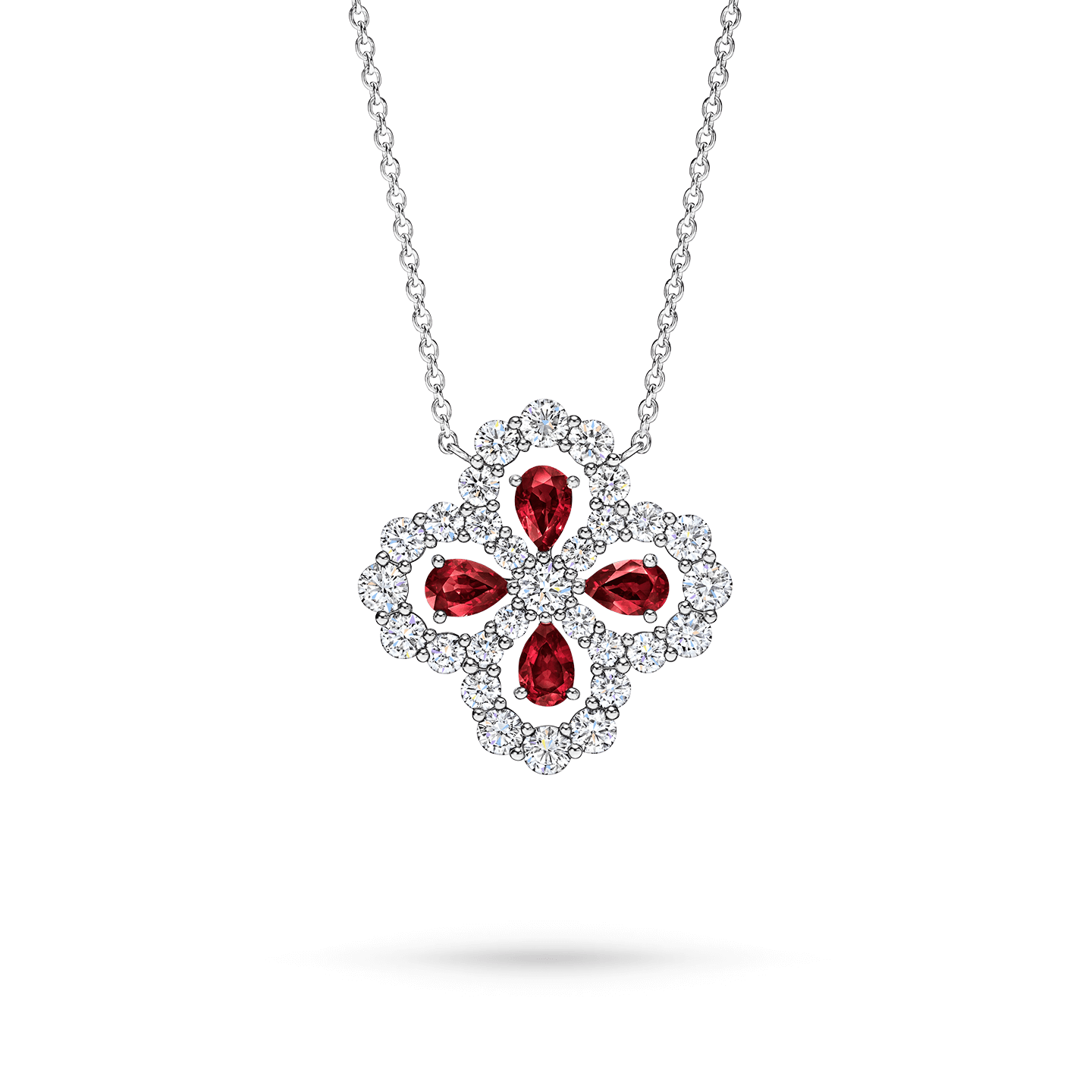 4颗总重约0.91克拉的水滴型切工红宝石和29颗总重约1.33克拉的圆形明亮式切工钻石,悉心镶嵌于铂金底座之上。