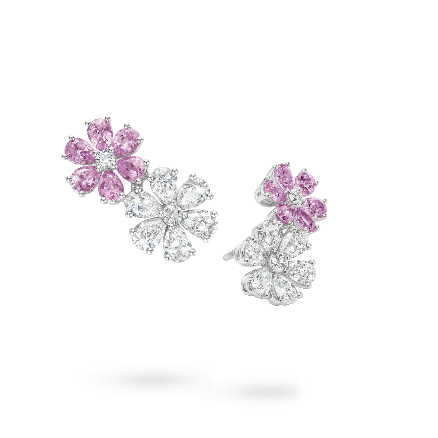 这对耳环汲取了花朵绽放时转瞬即逝的绝美特质,巧妙地将12颗水滴形粉色蓝宝石与水滴形和圆形明亮式切工钻石交织镶嵌,为耳畔增添了一抹柔和的粉色光芒,无论作何装扮,都平添了几分灵动的迷人魅力。