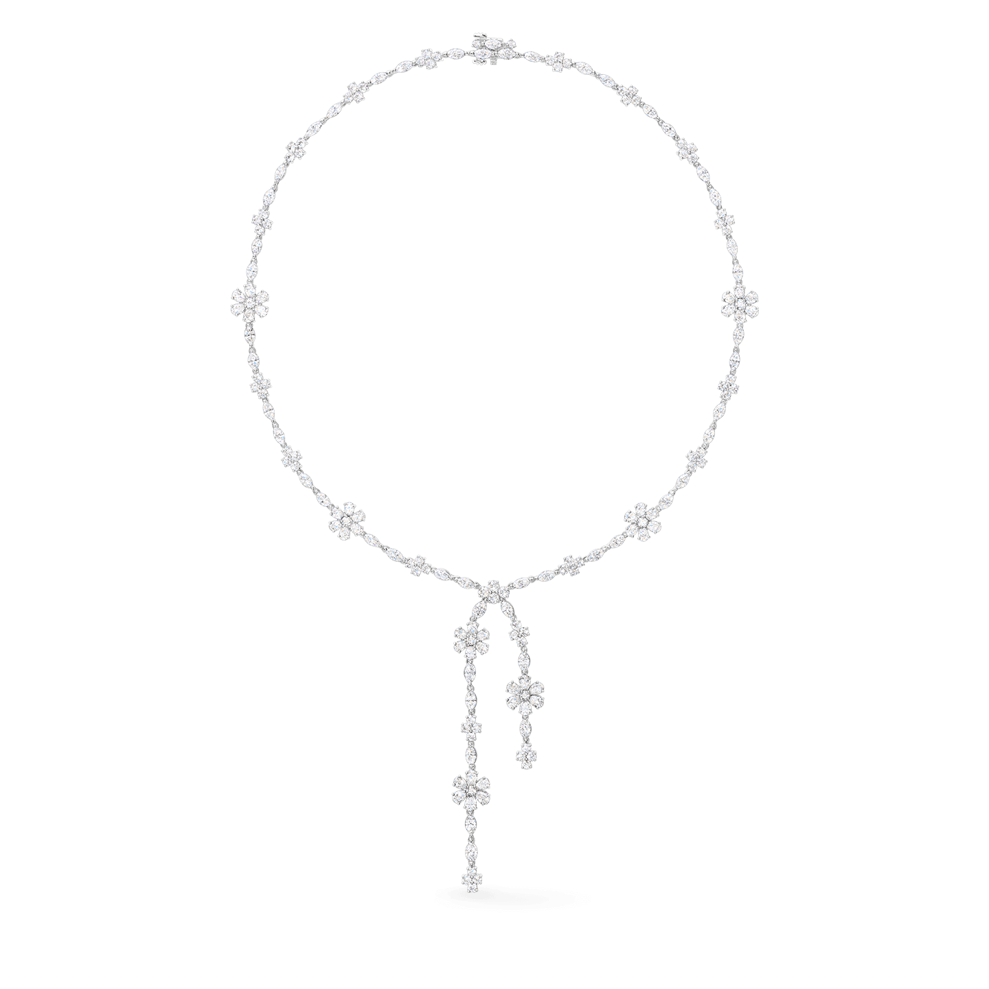这款引人瞩目的红宝石和钻石项链的灵感源自于雅致的勿忘我。78颗水滴形和圆形明亮式切工红宝石,总重约9.13克拉,搭配99颗总重约8.51克拉的榄尖形和圆形明亮式切工钻石,悉心镶嵌于铂金底座之上。精美垂坠的宝石凝聚璀璨光芒,尽释纯澈华彩。这款项链融汇了品牌通过珠宝作品对大自然的盛景,进行重新诠释的灵感巧思。华美迷人的设计在这款红宝石和钻石项链中见证着大自然的恒久美景,令人惊叹。