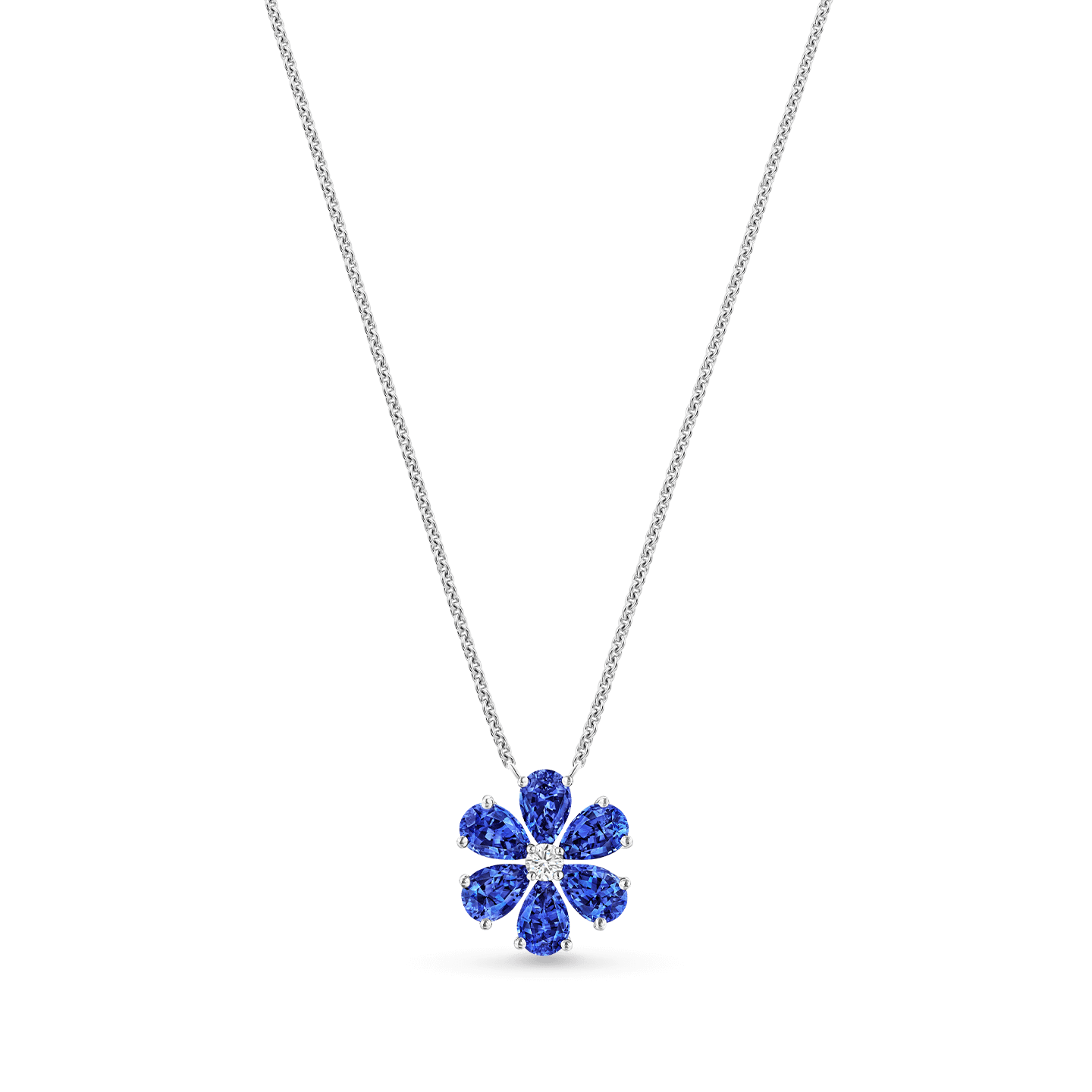 6颗水滴形切工,总重约1.41克拉的蓝宝石和1颗圆形明亮式切工,重约0.04克拉的钻石,悉心镶嵌于铂金底座之上。