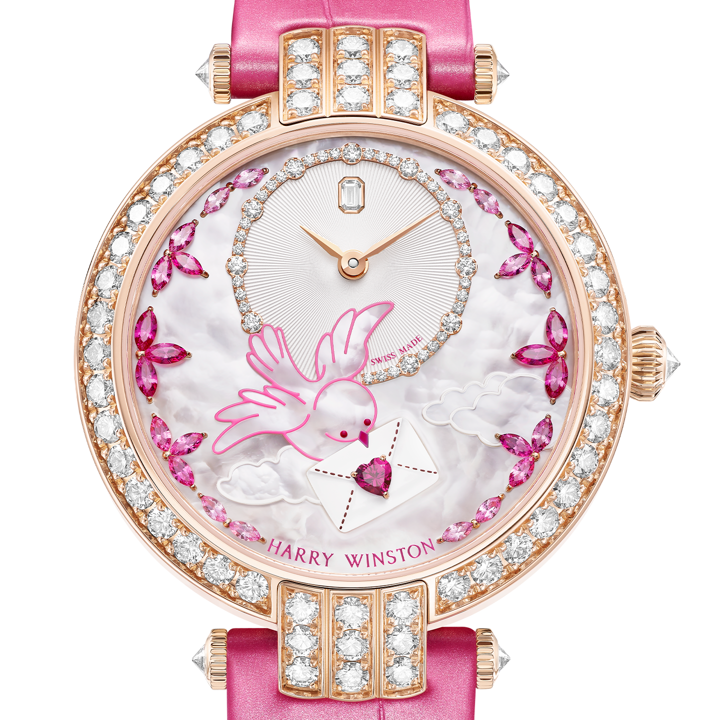 为礼赞2026年情人节,海瑞温斯顿卓时Premier系列推出一款浪漫的玫瑰金腕表。为探寻表达爱意的新方式,表盘上设计了一只衔着情书的漂亮小鸟。表盘采用海瑞温斯顿腕表的标志性元素——珍珠母贝打造,散发虹彩般的光泽,钻石和宝石则绽放永恒的璀璨光芒。