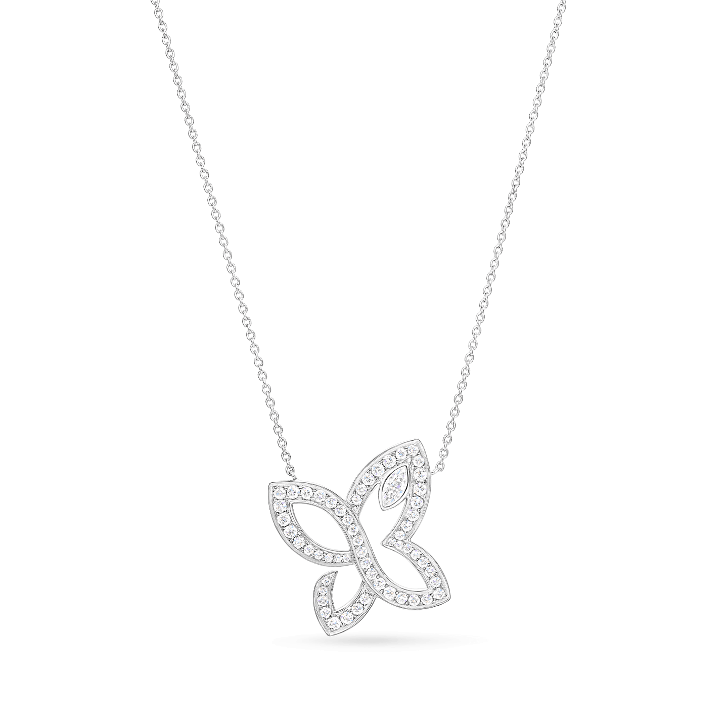 这款Infinite Lily Cluster项链由56颗圆形明亮式切工和1颗榄尖形切工钻石闪亮打造而成,诠释了美丽蝴蝶飞行中的迷人姿态。这件优雅而充满女性魅力的珠宝作品传达了爱情的无尽可能性,其优雅的设计仿佛既无起点亦无终止。