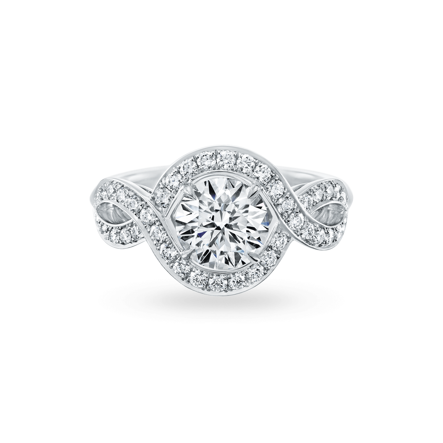 这款订婚钻戒的中央主钻可提供约0.50克拉到0.59克拉,0.70克拉到0.79克拉,1.00克拉到1.24克拉等多种选择,圆形明亮式切工中央主钻外圈以极细微密钉镶嵌钻石围绕,镶嵌于铂金戒环上。