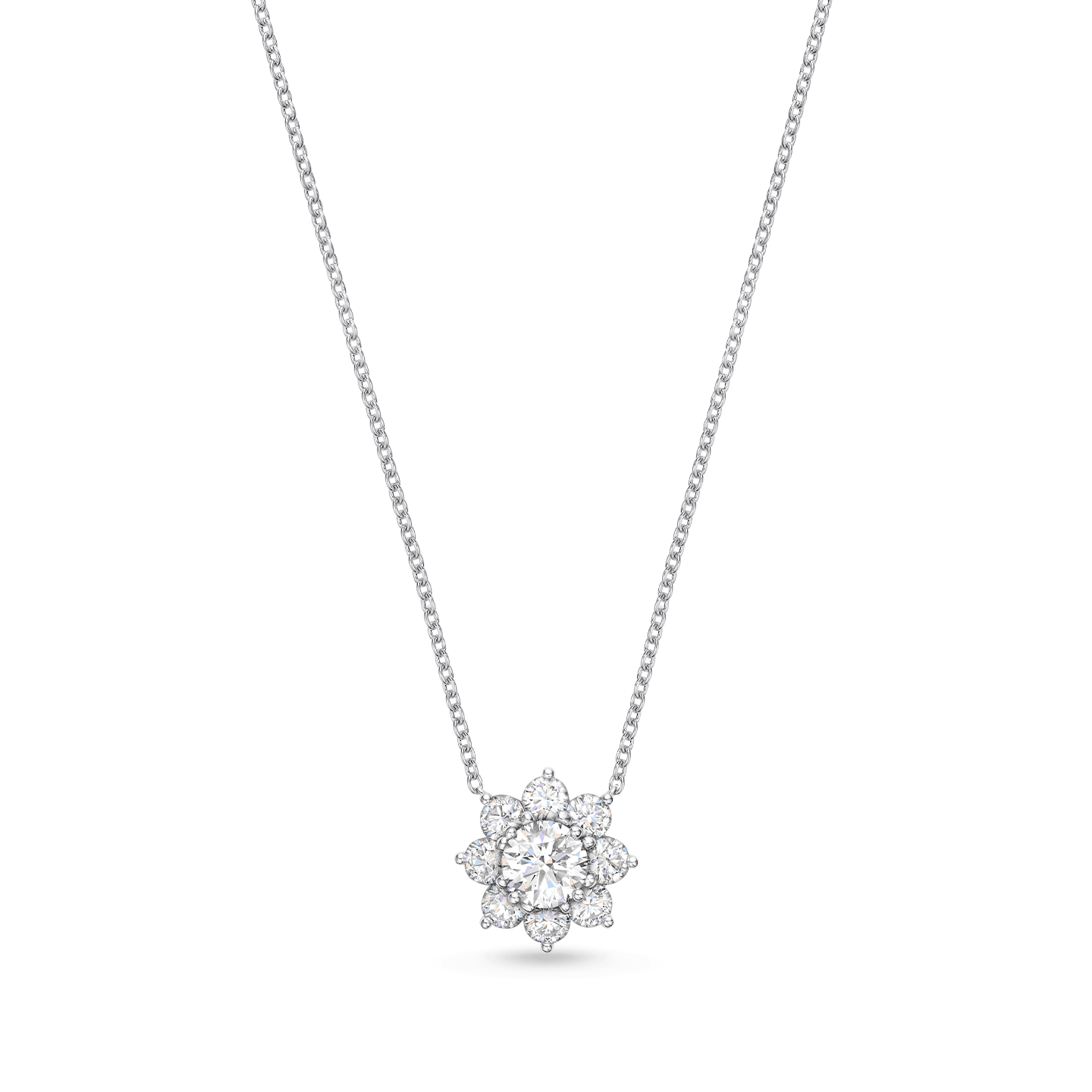 一颗重约0.7克拉的中央主钻,环绕点缀9颗圆形明亮式切工,总重约1.55克拉的钻石,悉心镶嵌于铂金底座之上。