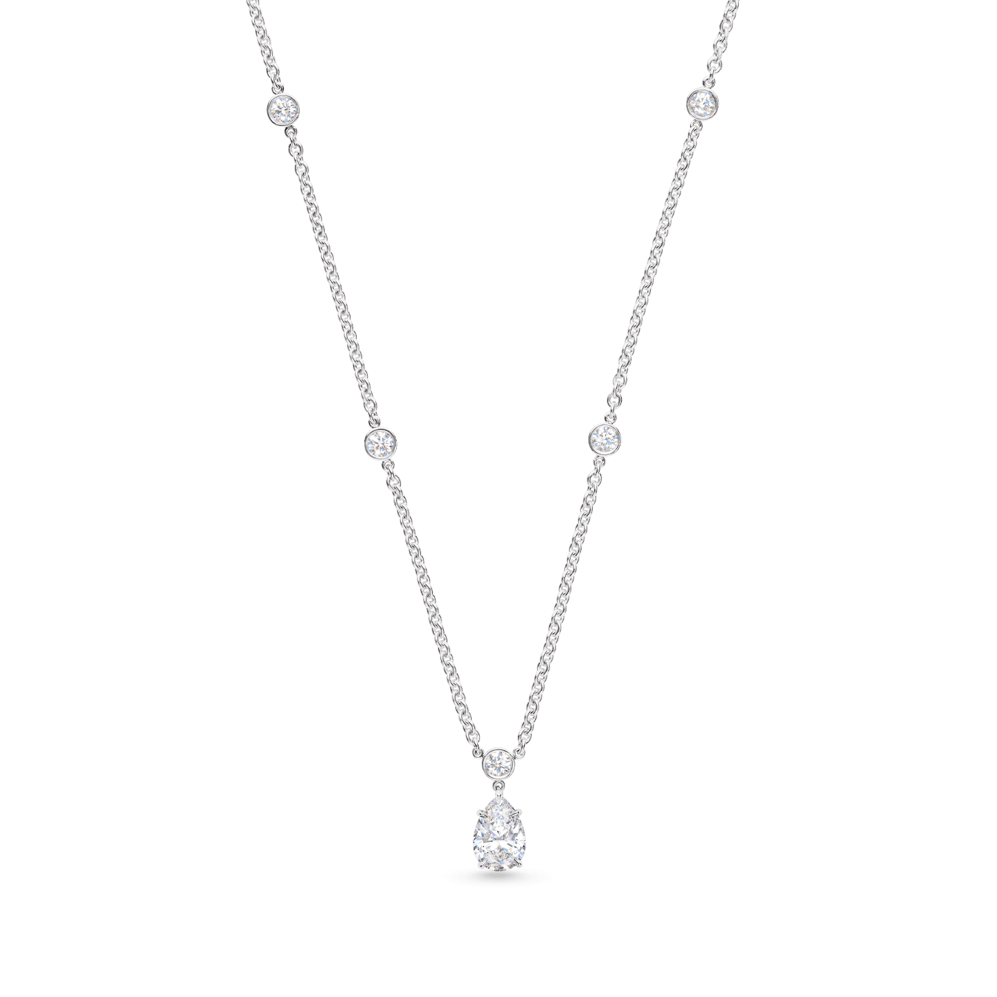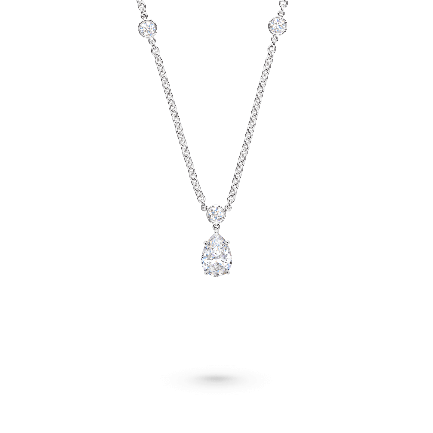 單顆水滴型切工鑽滴鏈墜,重量由2.00克拉至2.24克拉,搭配鑲嵌著9顆圓形明亮式切工鑽石的Rondelle鉑金項鍊上。