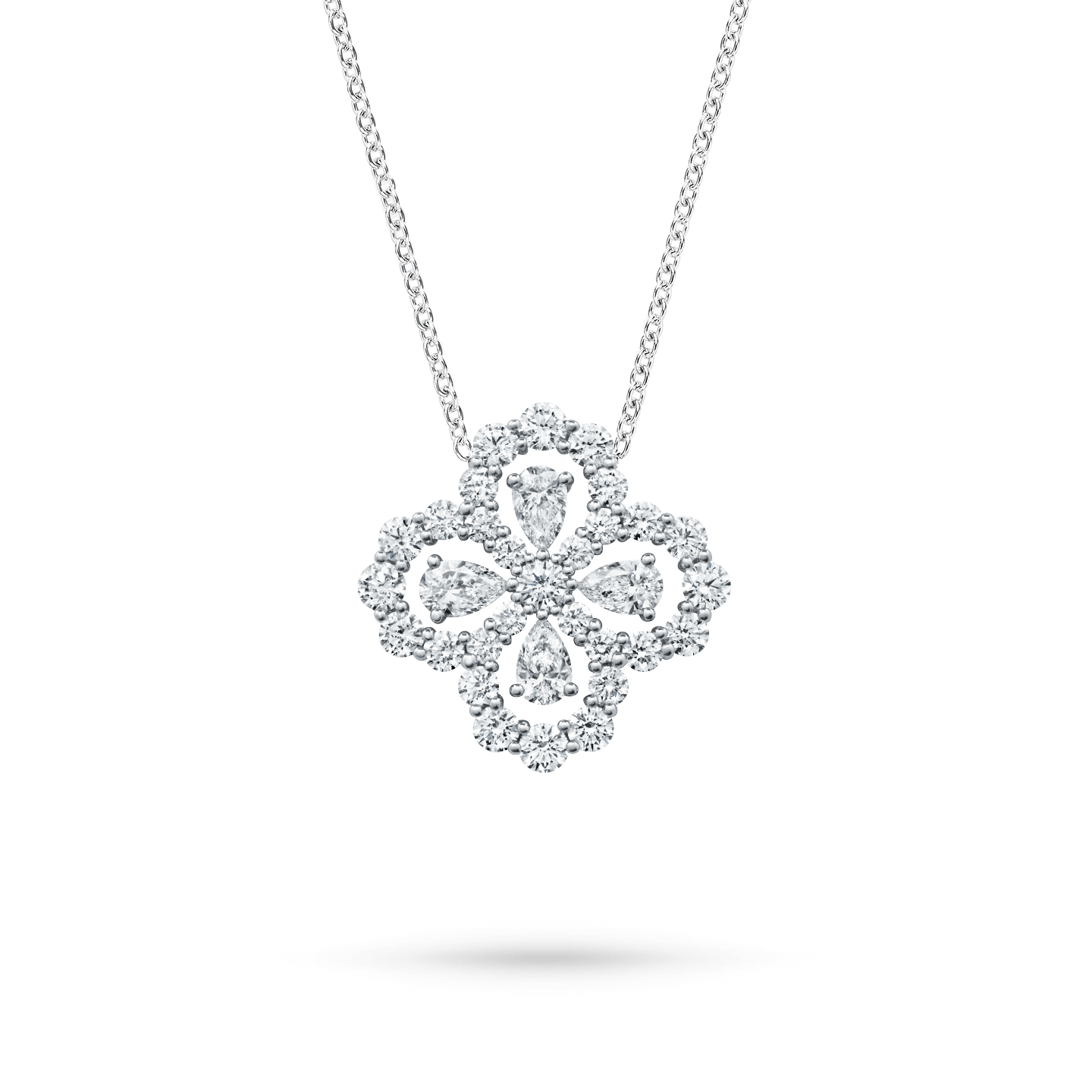 4顆水滴型切工鑽石及29顆圓形明亮式切工鑽石悉心鑲嵌於鉑金底座,鑽石總重約1.89克拉。