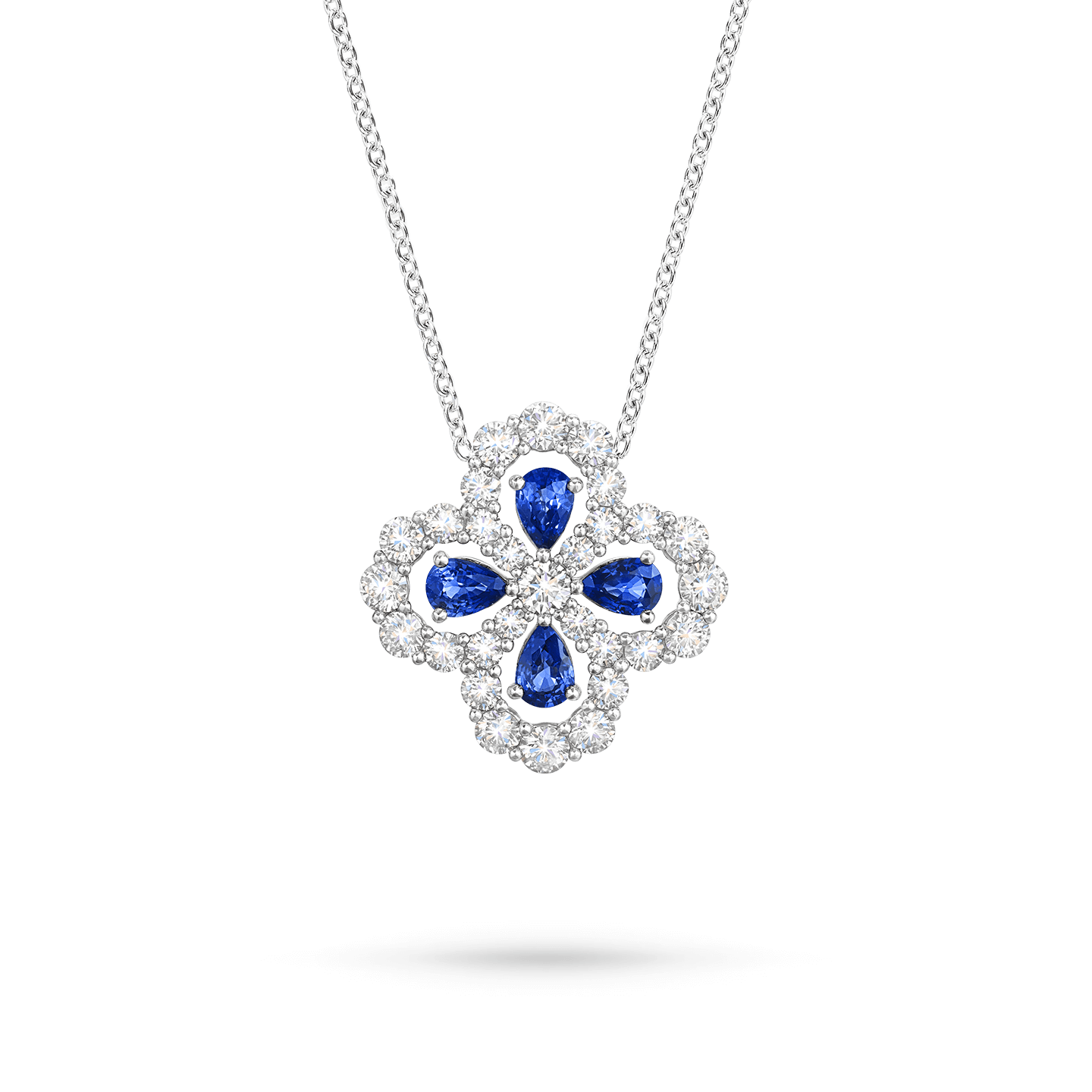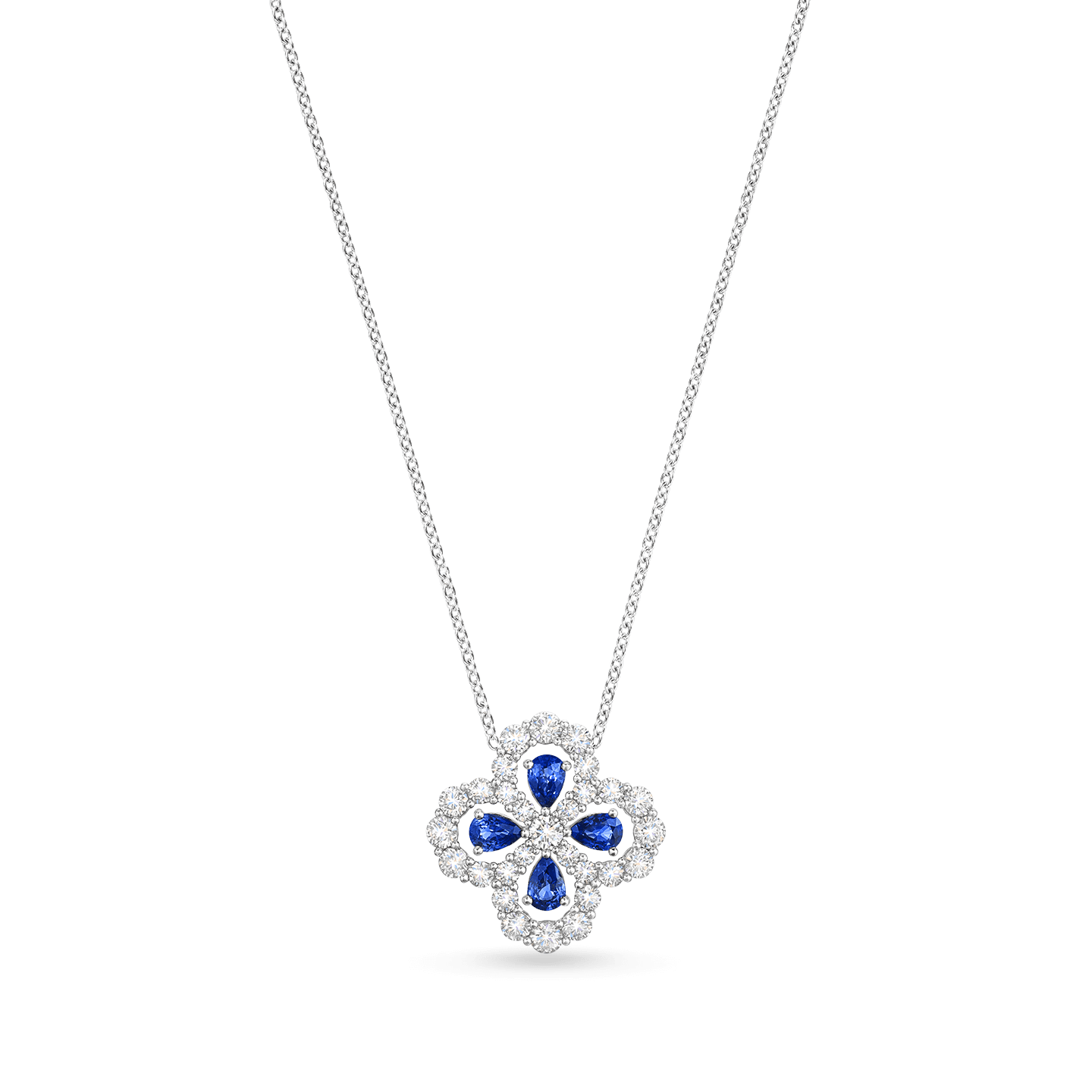 這款墜鍊是對海瑞溫斯頓經典輪廓的現代詮釋,完美展現了水滴型切工的雋永之美。四顆水滴型切工藍寶石,以圓形明亮式切工鑽石環繞,鑲嵌於線條流暢的鉑金底座中,綻放優雅光采。無論是日常配戴,或作為造型焦點,這款珠寶皆完美體現了海瑞溫斯頓的精神——經典設計與現代風格的極致融合。