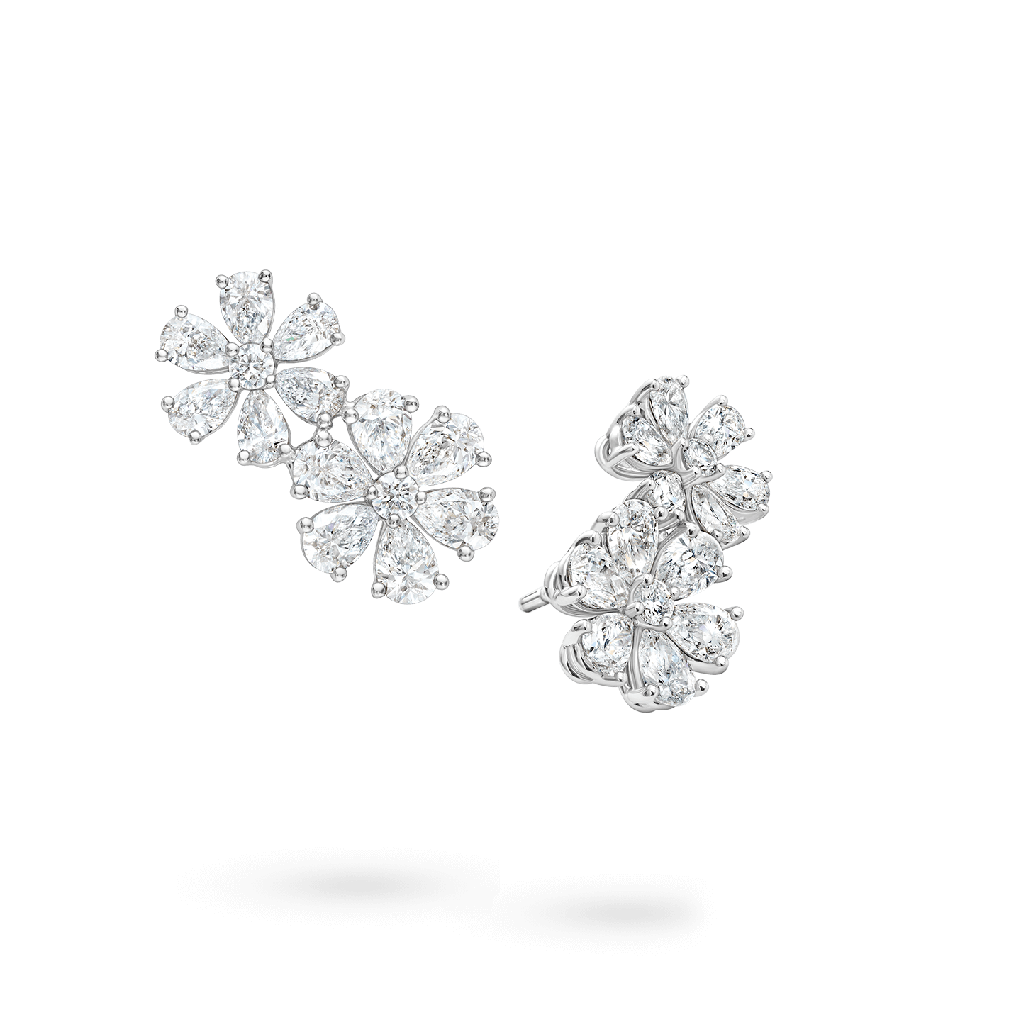 這款鑽石雙花耳環,巧妙融合了山野鮮花的爛漫隨性與匠心設計的靜謐雅致。每顆水滴形和圓形明亮式切工的鑽石,跟隨佩戴者的一舉一動,折射出璀璨的靈動光芒。