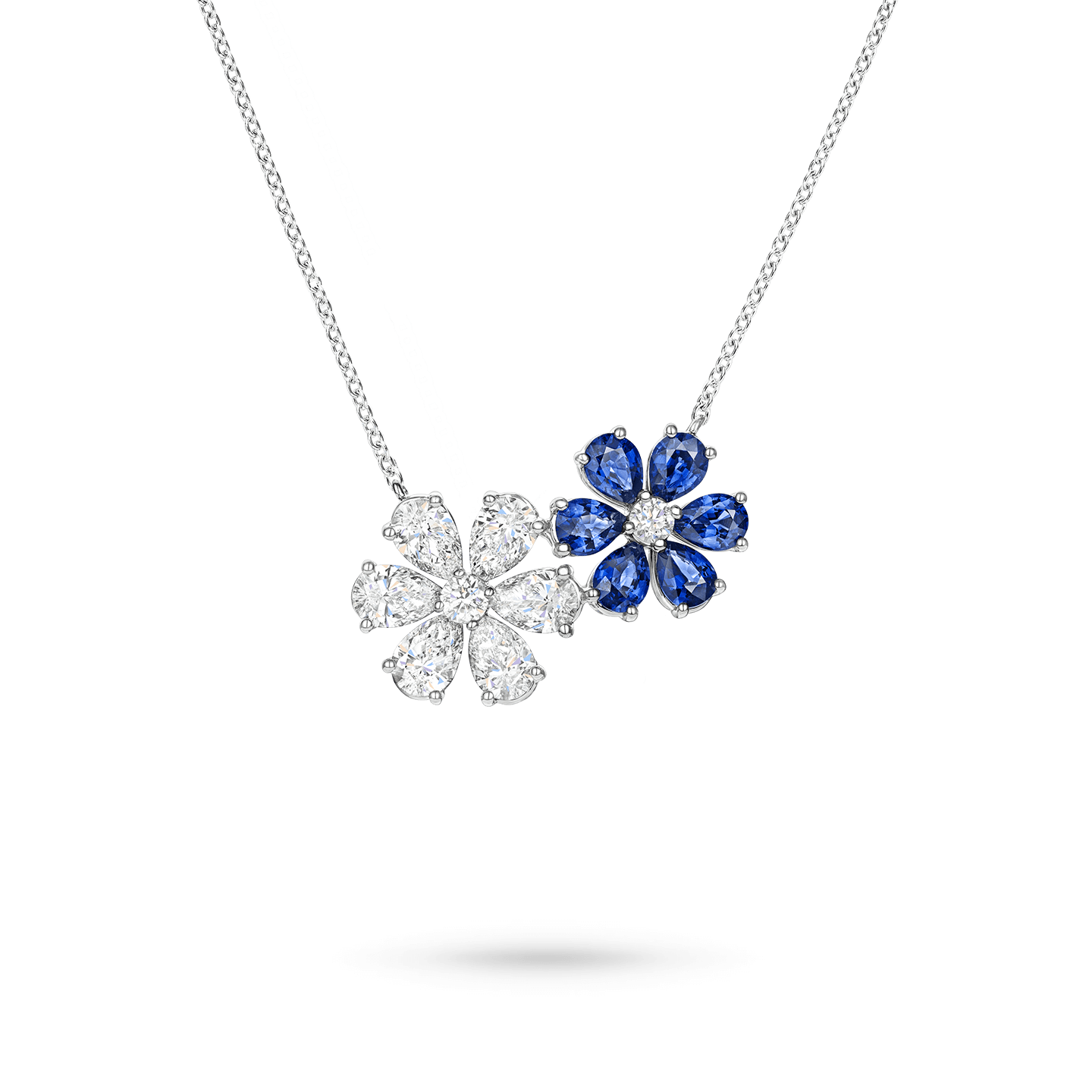 這款優雅的 Forget-Me-Not 項鍊鑲嵌6顆水滴形藍寶石,搭配水滴形和圓形明亮式切工鑽石,閃耀迷人光芒。以綻放的鮮花為靈感,這件作品為頸部線條點綴了一抹動人的藍色。