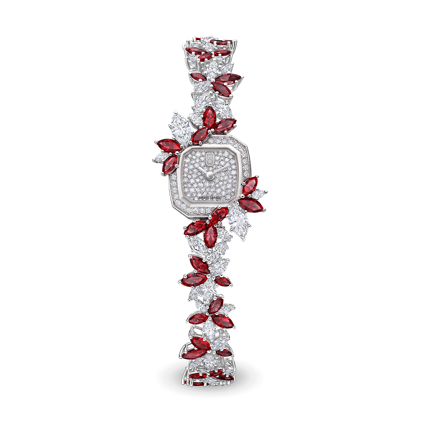 靈感源自大自然,並鑲嵌珍稀頂級的鑽石,Precious Emerald 腕錶優雅呈現海瑞溫斯頓頂級珠寶腕錶系列。此系列腕錶重新演繹品牌最為珍視的設計概念,搭配以鉑金打造的絢麗錶鍊,悉心鑲嵌鑽石與紅寶石,璀璨耀眼,綻放非凡風華。