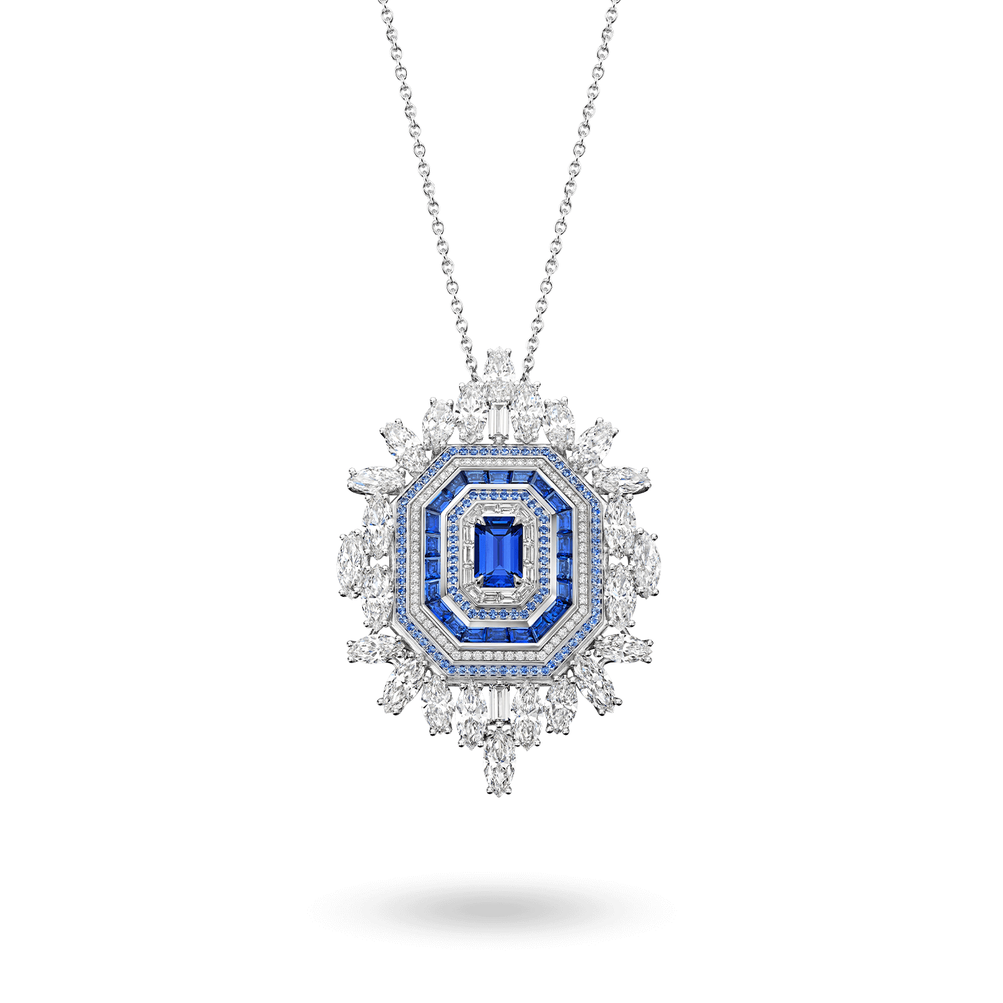 Ultimate Emerald Signature腕錶是海瑞溫斯頓頂級珠寶腕錶家族中最為引人矚目的作品。2021年品牌推出以藍寶石打造的全新錶款,獨一無二的造型令其成為紅毯上聚焦目光的華麗焦點。同時它的設計可以搭配多種不同的佩戴方式:既可環繞於手腕亦可作為項鍊垂於頸間,或者作為胸針增添光彩於胸前。