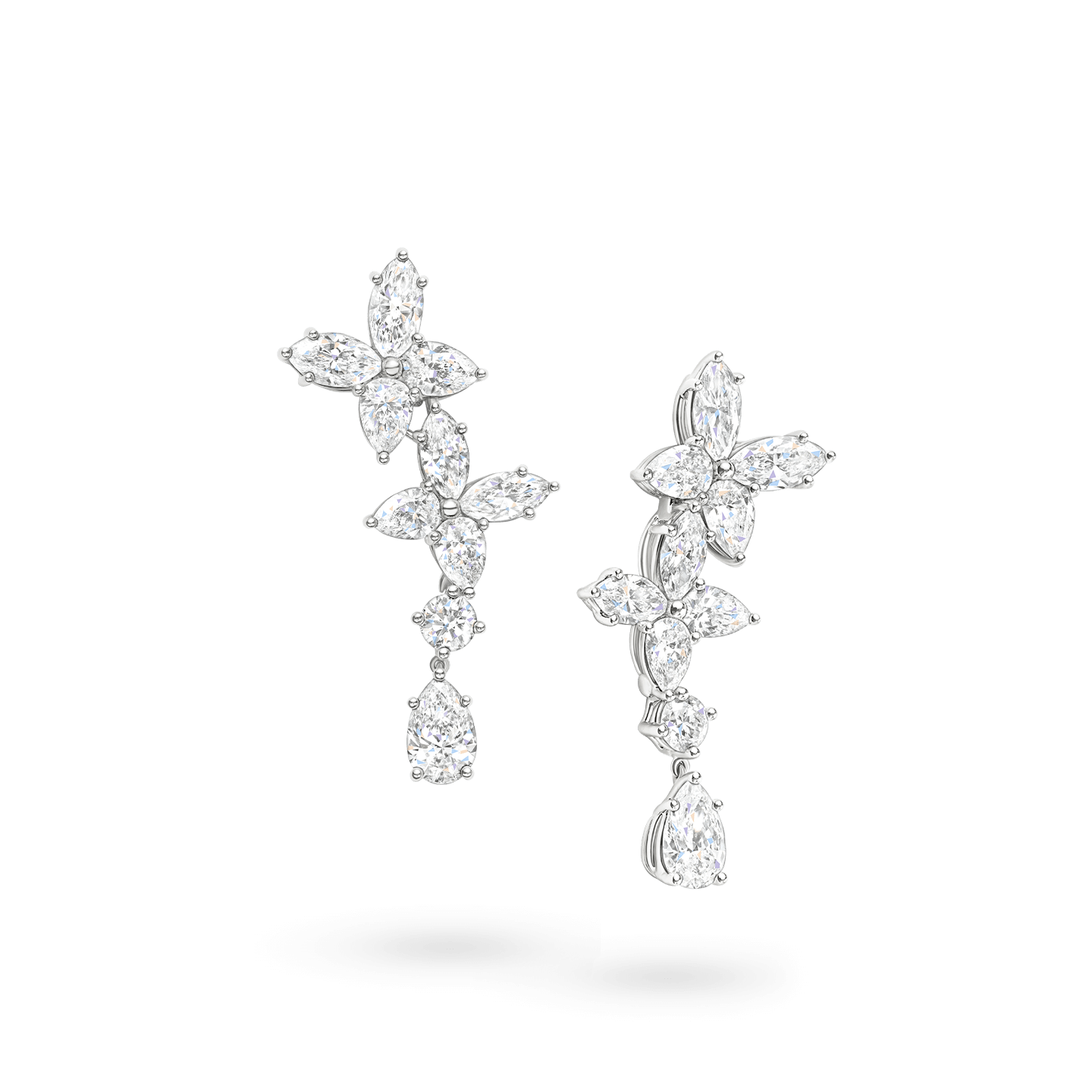 Marquesa Cascading 鑽石耳環以 20 顆精心切工鑽石打造,閃耀奪目,宛如瀑布般傾瀉而下,散發迷人光彩,點綴耳畔。馬眼型、水滴型和圓形明亮式切工鑽石的驚艷組合,營造出令人沉醉的魅力,為耳畔增添非凡光彩。