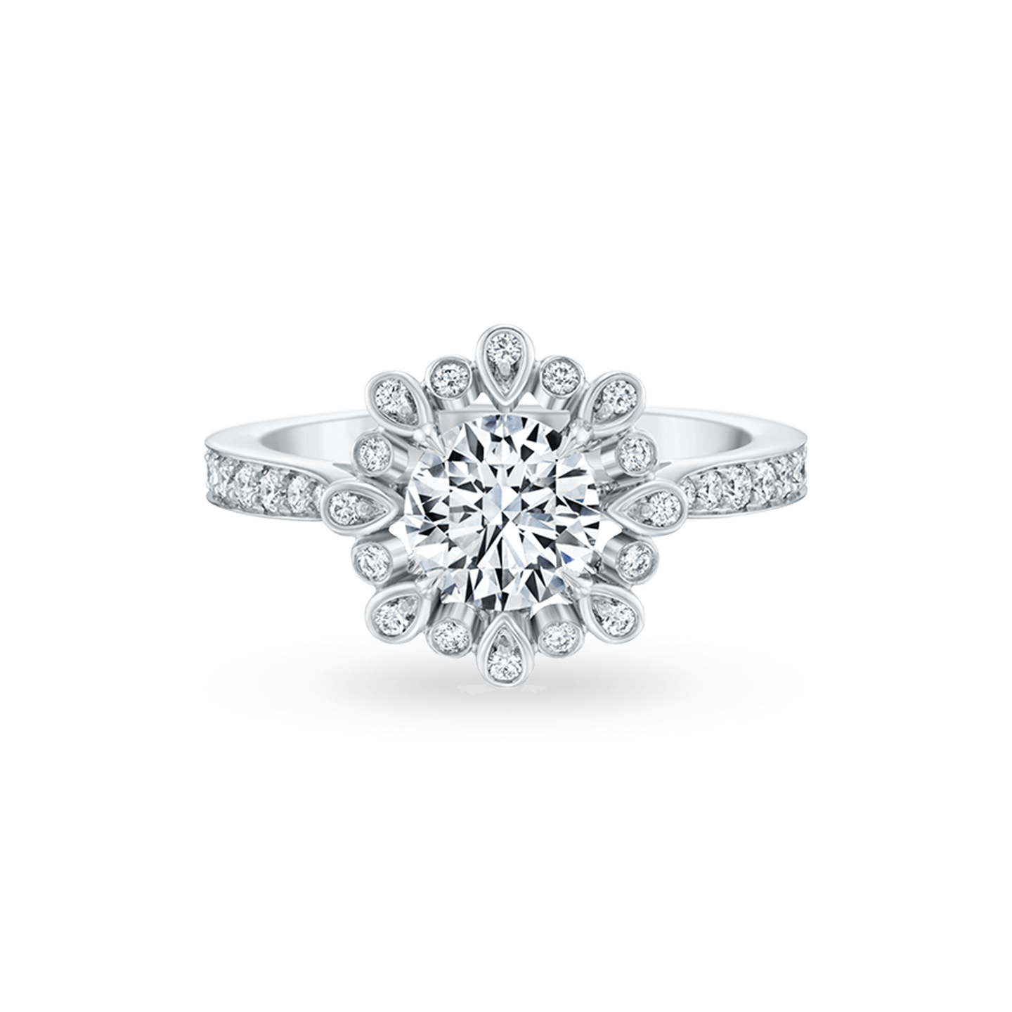 這款以花卉意像作為設計靈感的訂婚鑽戒,中央主鑽可提供0.50克拉到0.59克拉,0.70克拉到0.79克拉,1.00克拉到1.24克拉等多種選擇。鑲嵌於極細微密釘鑲嵌的鑽石戒環上,搭配鉑金底座。